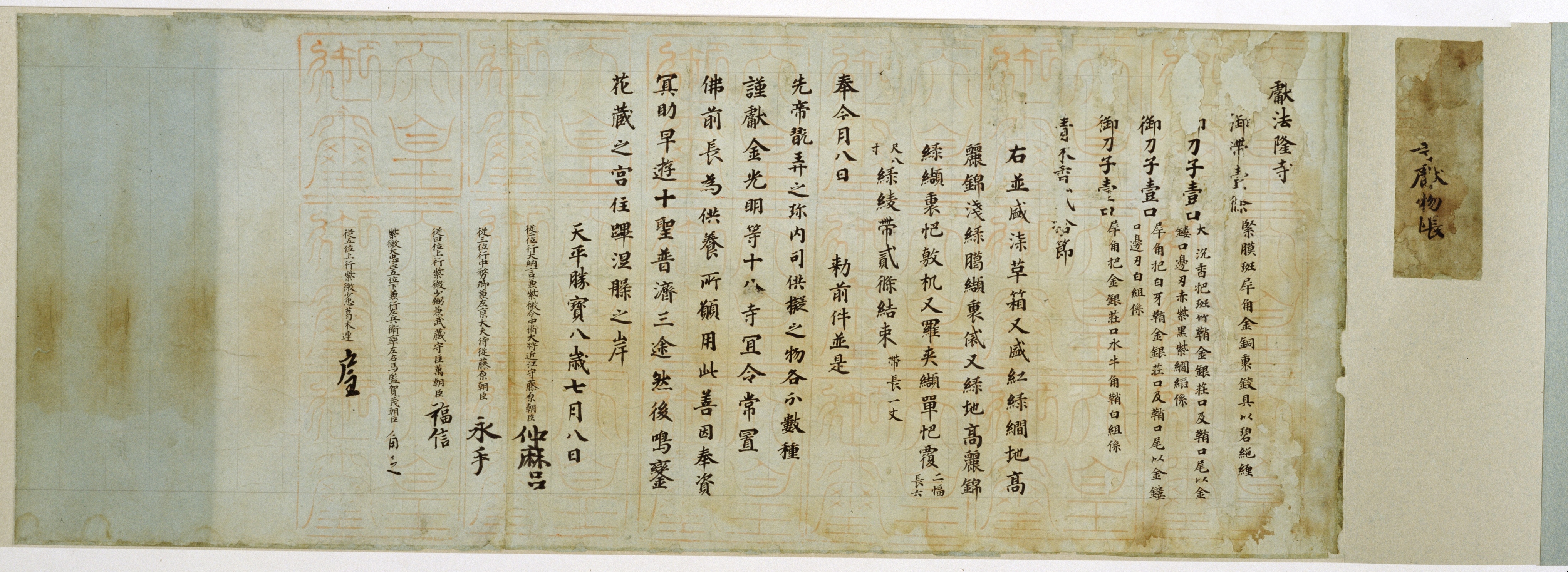 English: Record of the objects bequeathed to the Hōryū-ji temple by Empress Kōken on occasion of the death of Emperor Shōmu. |