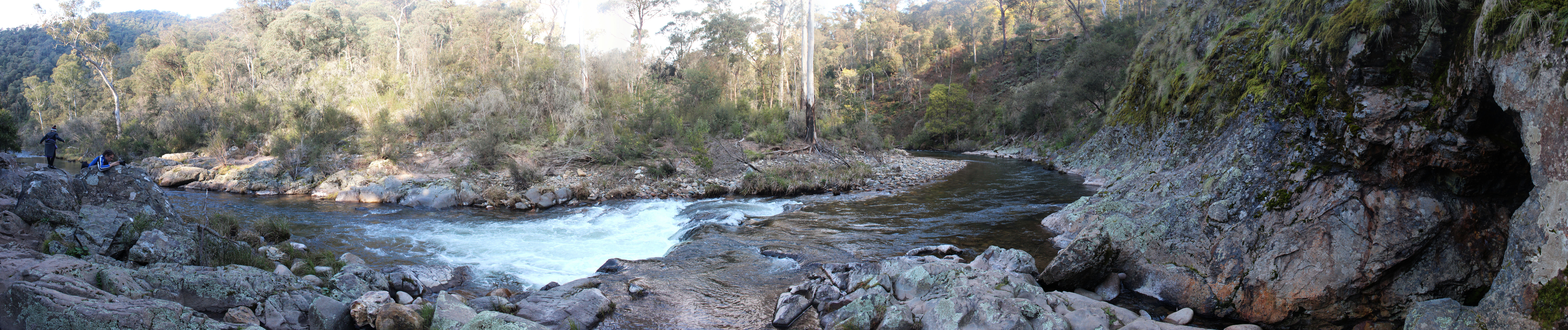 English: Howqua River, Howqua Hills Historic Park, Victoria, Australia. The opening to a tunnel is on the far right. Gold miners dug this tunnel about 100 metres through the rock of the spur, and then built a water race along the contour of the hills to carry water 4 km to a 63 foot water wheel which powered crushing and milling equipment at the Howqua United gold treatment works at Sheepyard Flat (near the location of Fry's Hut). It was built in 1884, during the Victorian gold rush. |