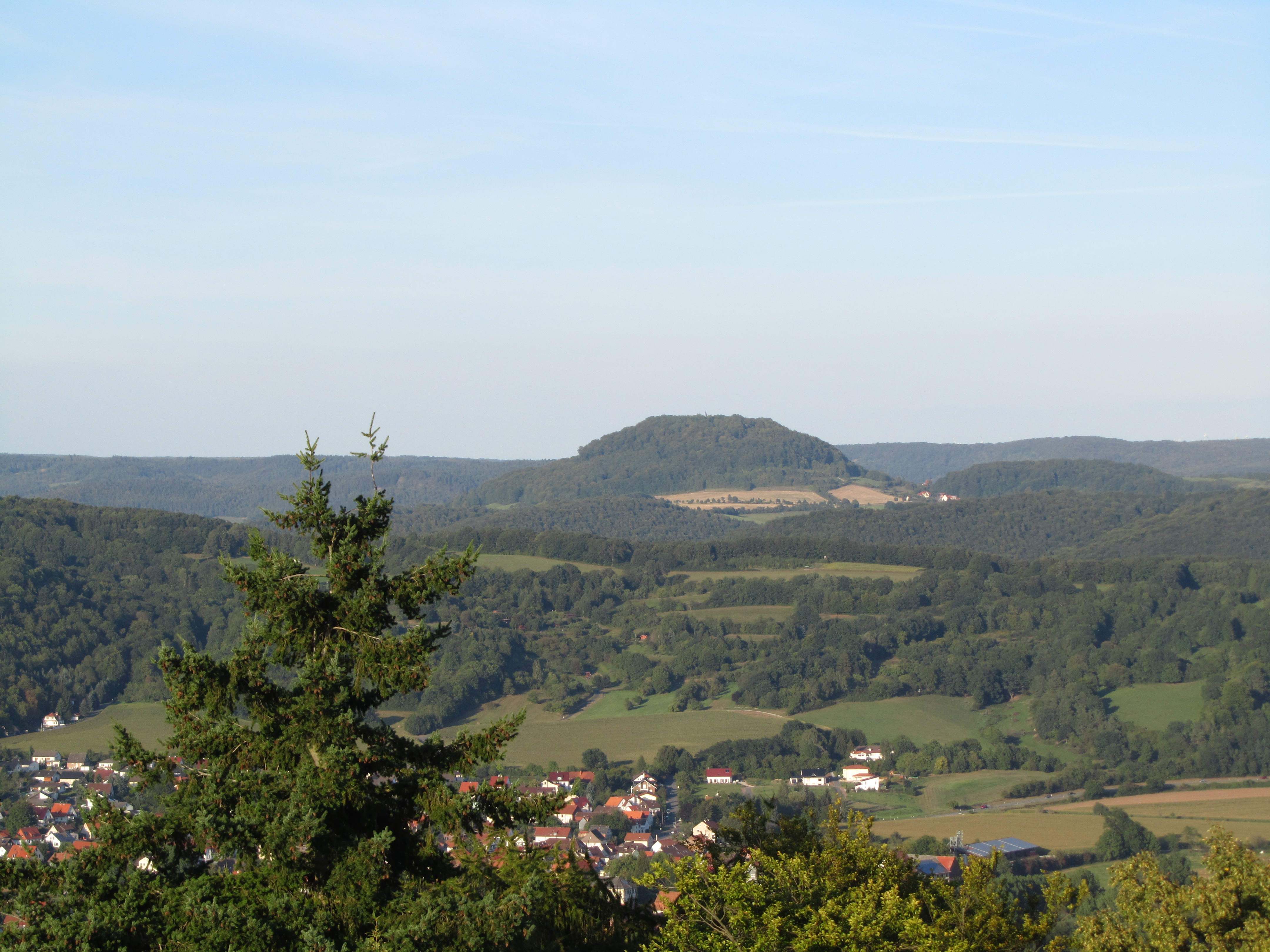 Deutsch: Der Hülfensberg von Südwesten, gesehen vom Bismarckturm auf dem Großen Leuchtberg. Im Werratal die Ortschaft Schwebda, dahinter der Kahlenberg, rechts unterhalb des Hülfensberges ein Teil von Bebendorf, im Hintergrund die Höhen des Obereichsfeldes (links der Westerwald und rechts der Uhlenstein) |