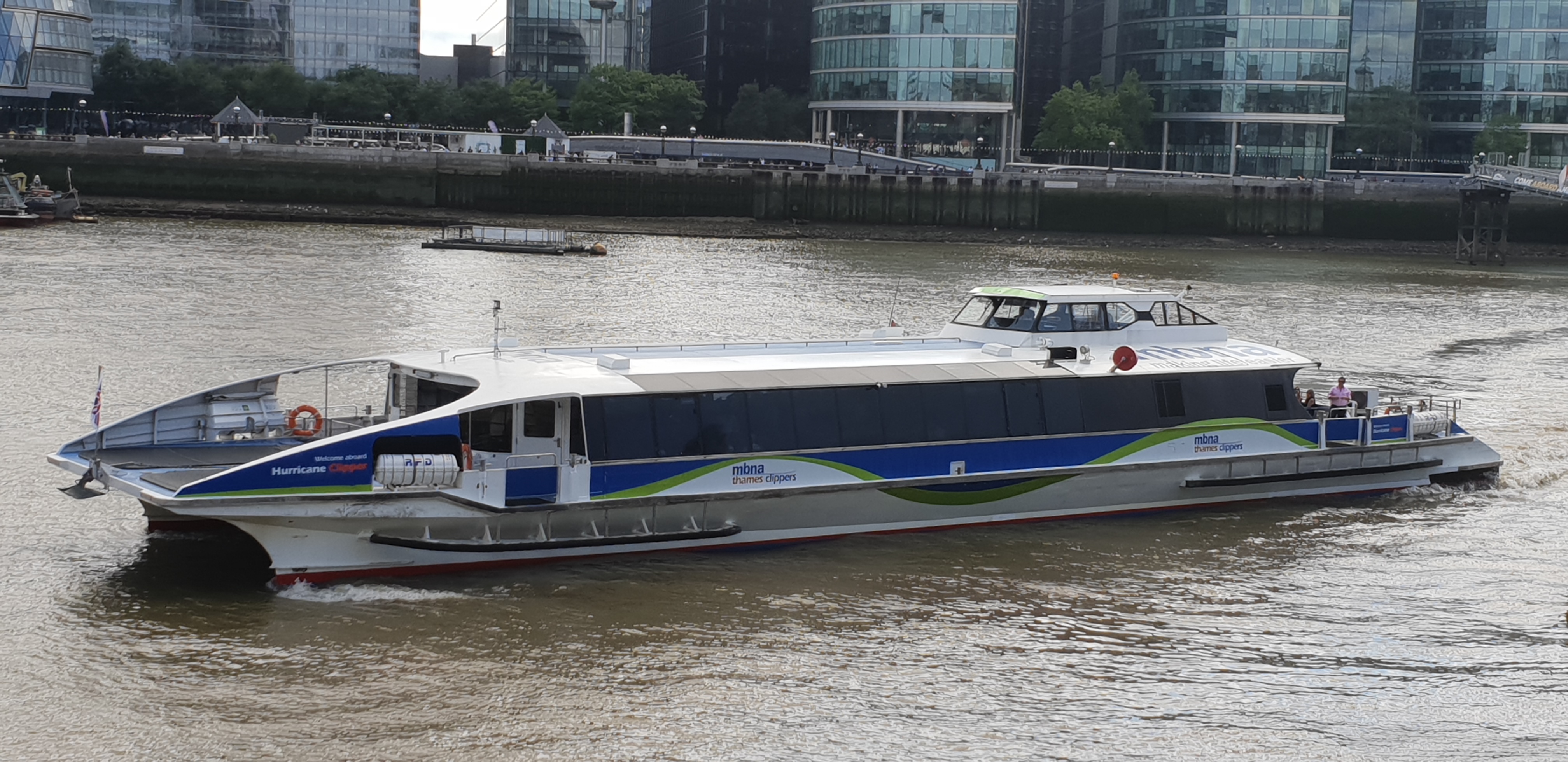 English: Thames Clipper vessel Hurricane Clipper manoeuvring off Tower Pier in London |