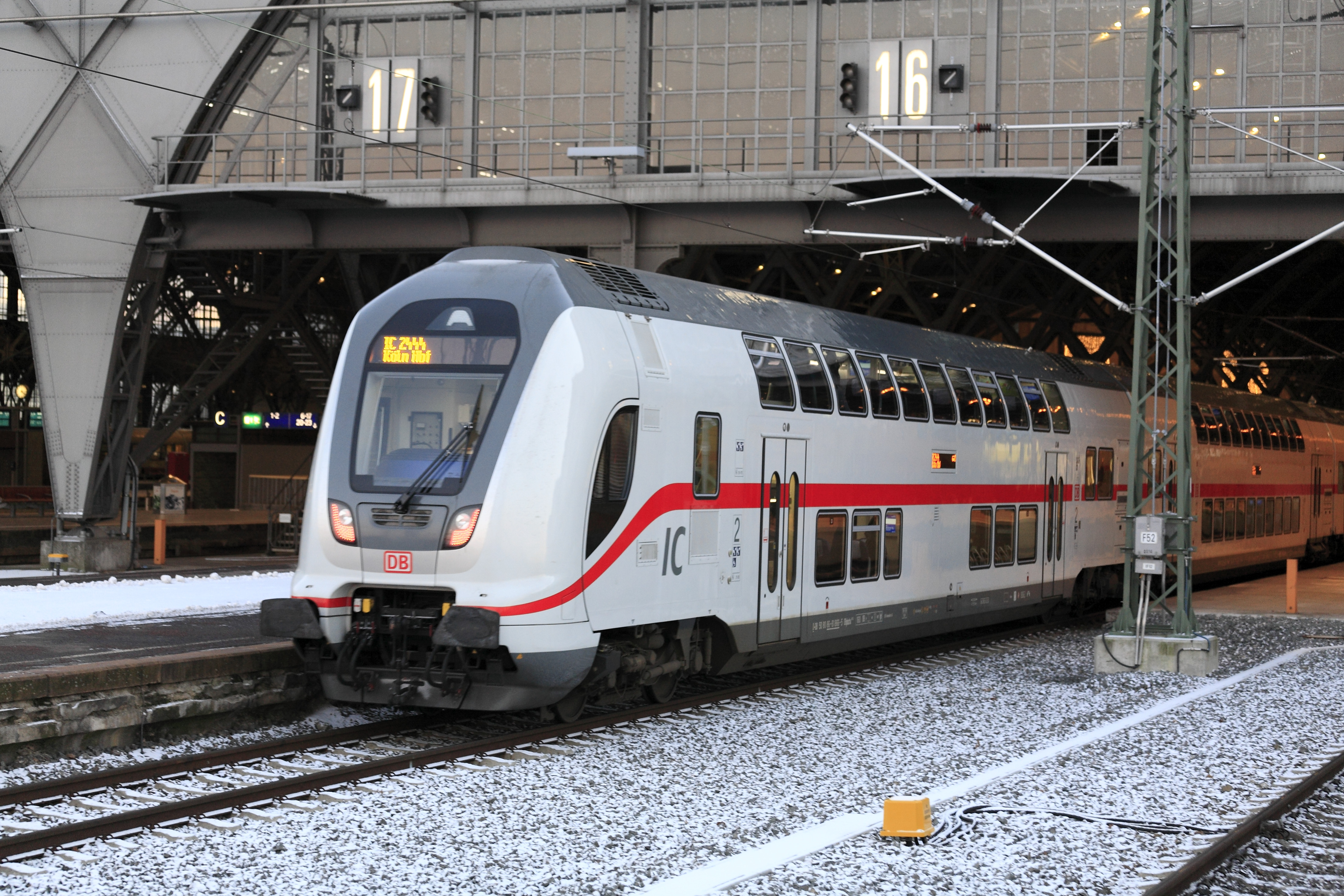 Deutsch: IC2-Fernbahndoppelstockzug als IC2444 von Dresden nach Köln einfahrend nach Gleis 16, Nachschuss. Der Steuerwagen läuft am Schluss. Die Gepäckbahnsteige wurden im Umbaubereich vollständig beseitigt, der Raum wurde für sicherungstechnische Anlagenteile benötigt. |