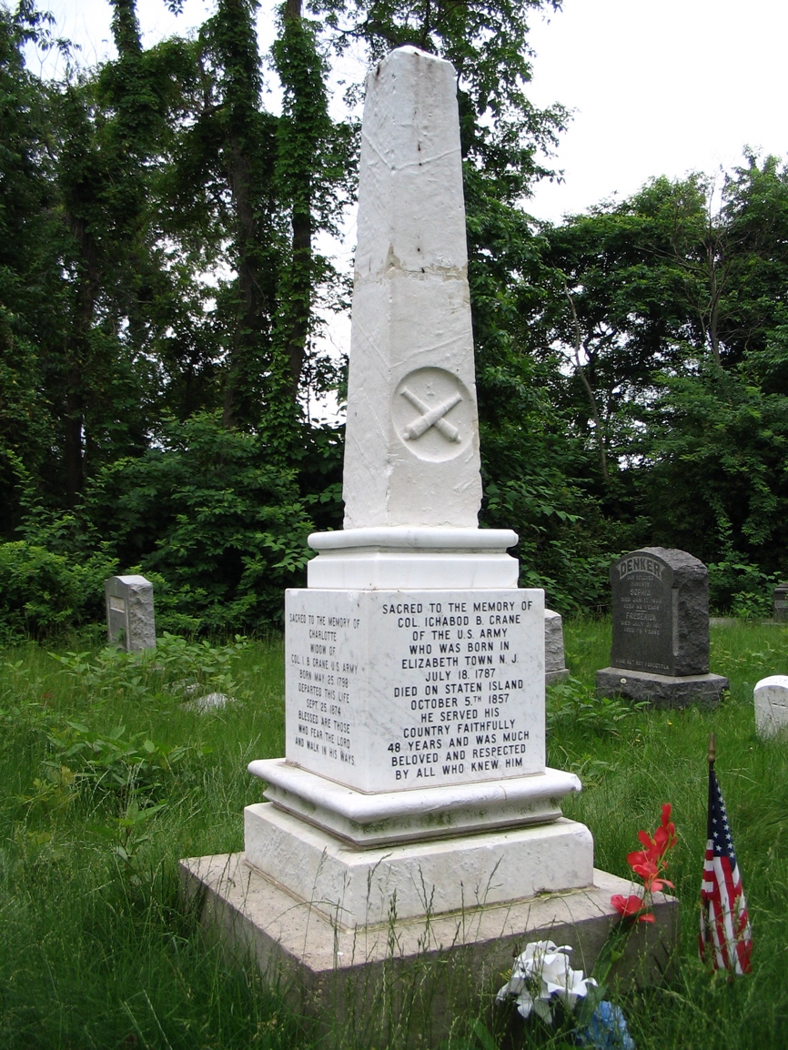 Description Ichabod Crane monument. Asbury Methodist Cemetery, Staten Island, New York.