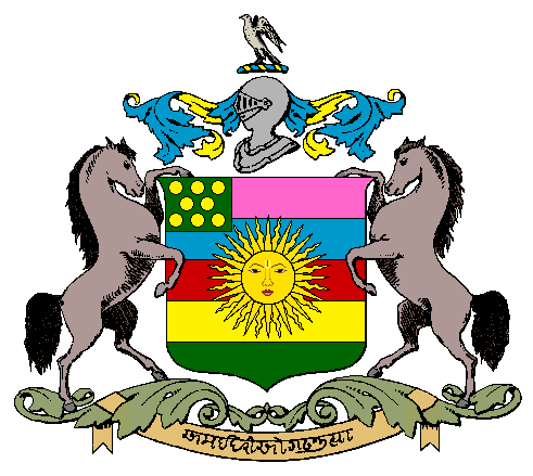English: Idar State Coat of Arms Arms: Barry of five Tenné, Gules, Azure, Vert and Or, a sun in splendour Argent and Or, and a canton Or. Crest: On a helmet affronté lambrequined (Gules and Argent?) a falcon rising proper. Supporters: Two horses proper. Badge: Two swords in saltire, placed beneath the shield. Motto: The motto written in devanagiri in golden lettering on a blue ribbon. |