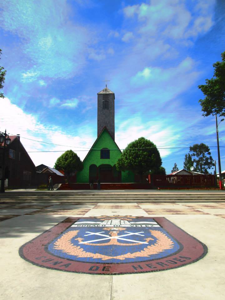 Español: Iglesia de Curaco de Vélez con el escudo en la plaza. |