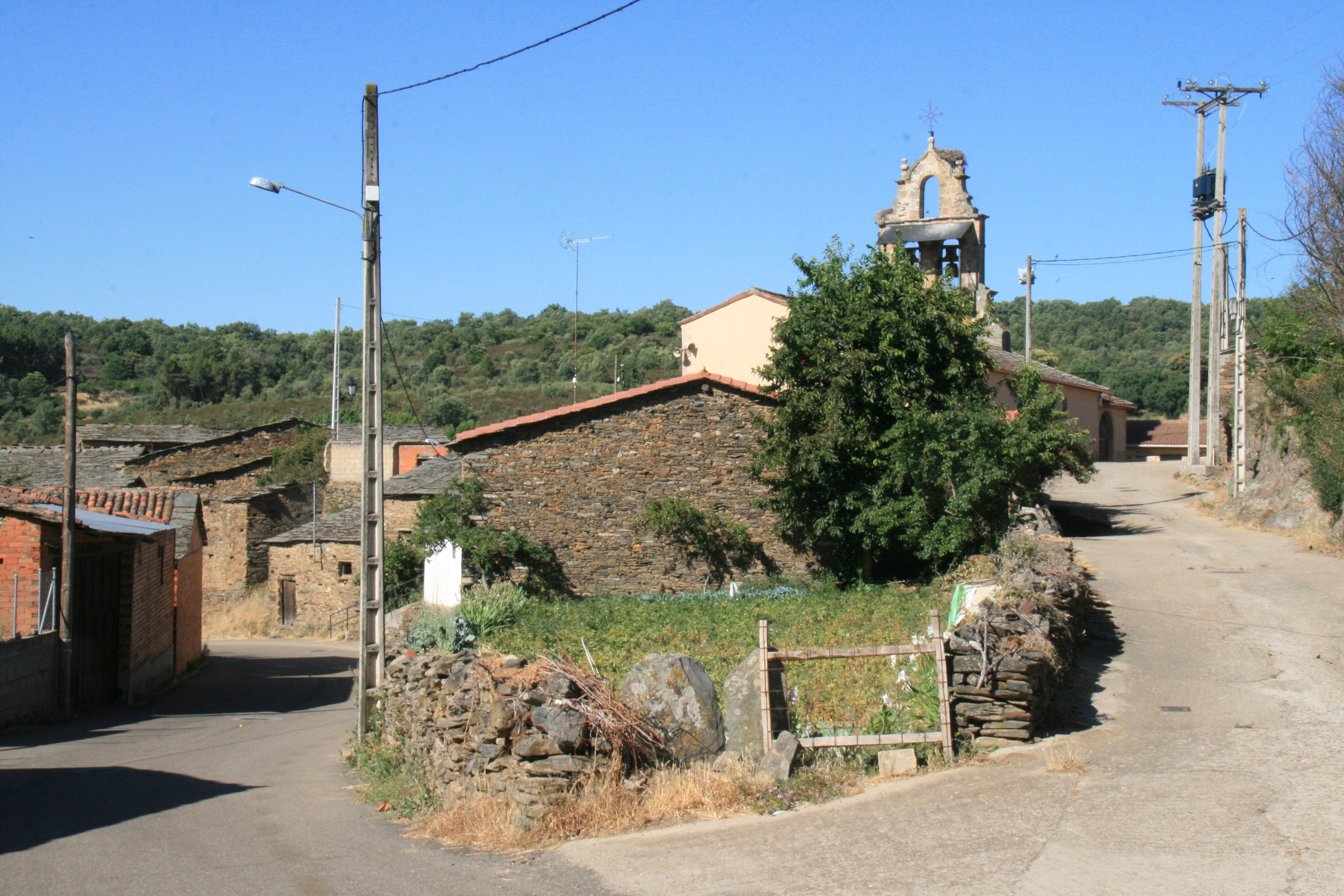 Español: Calle en cuesta con fondo en la iglesia de San Mamés - Bercianos de Aliste - Zamora |