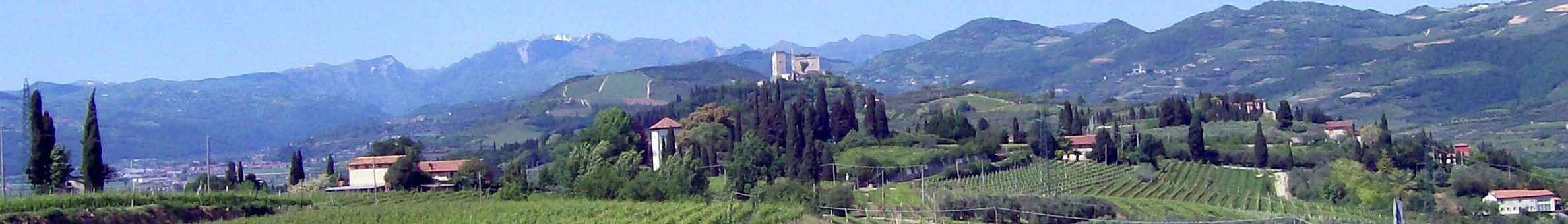 Italiano: Veduta verso nord dalla strada che porta da Bocca Scalucce a villa Trabucchi. Al centro il castello d'Illasi, il Monte Garzon (o Gardon) e in lontananza il Gruppo del Carega. A sinistra s'intravede l'abitato di Tregnago e a sinistra la chiesa parrocchiale di Campiano.