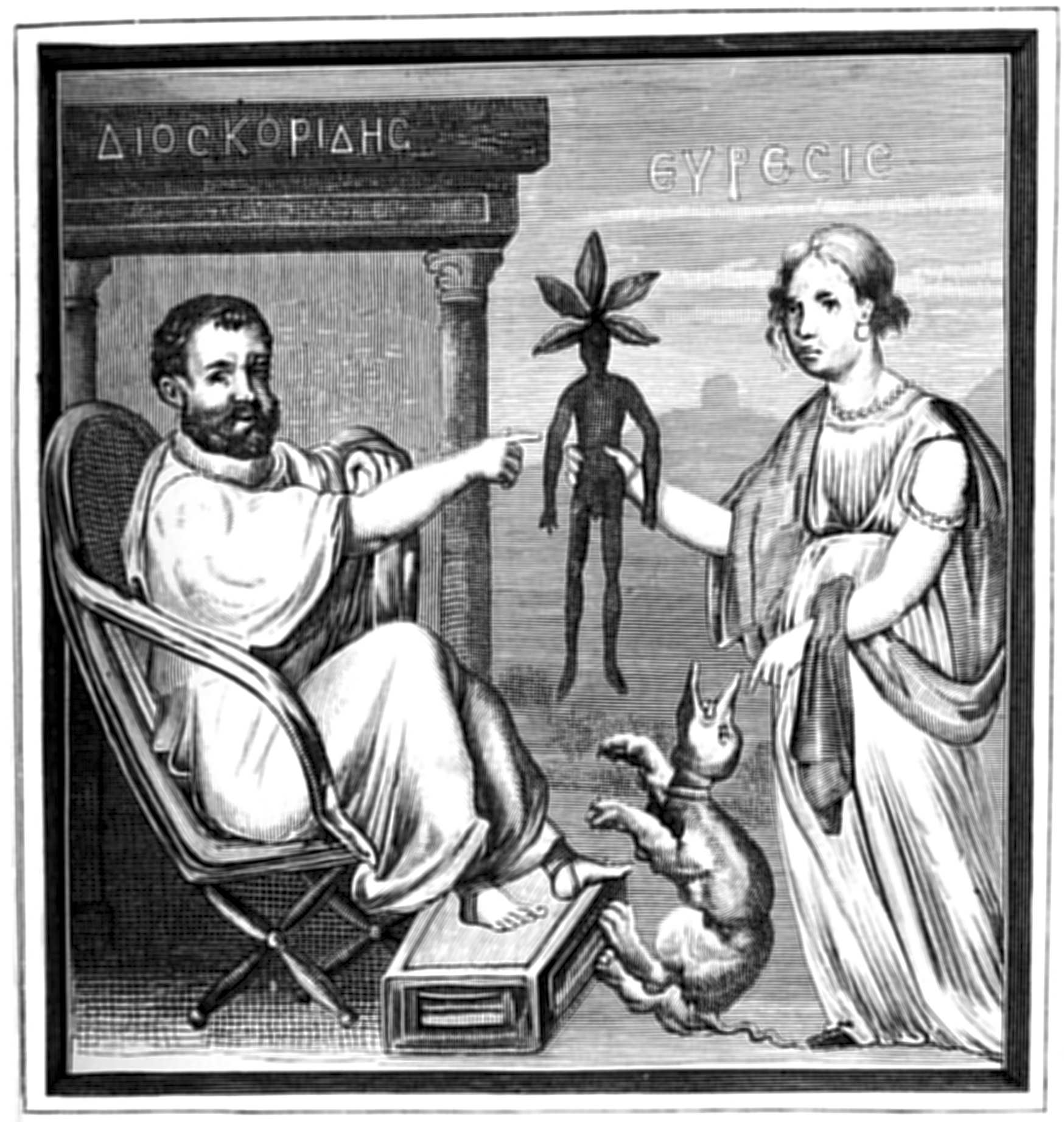 Fig. 7. Miniature from the manuscript of the work on Botany by Dioscorides, executed in Constantinople about 500 A.D. It represents Dioscorides seated on a sort of throne; in front is a female figure Euresis (Discovery) presenting to him the magic plant mandragora (mandrake). The dying dog refers to the popular belief, given by Josephus, as to the manner in which the mandrake was gathered. When plucked from the ground the mandrake uttered a scream which caused the death of any living creature that heard it; it was therefore usual to tie a dog to the plant and retire to a safe distance before calling it, and so causing the dog to drag the plant out of the ground. On hearing the scream the dog dropped down dead. |