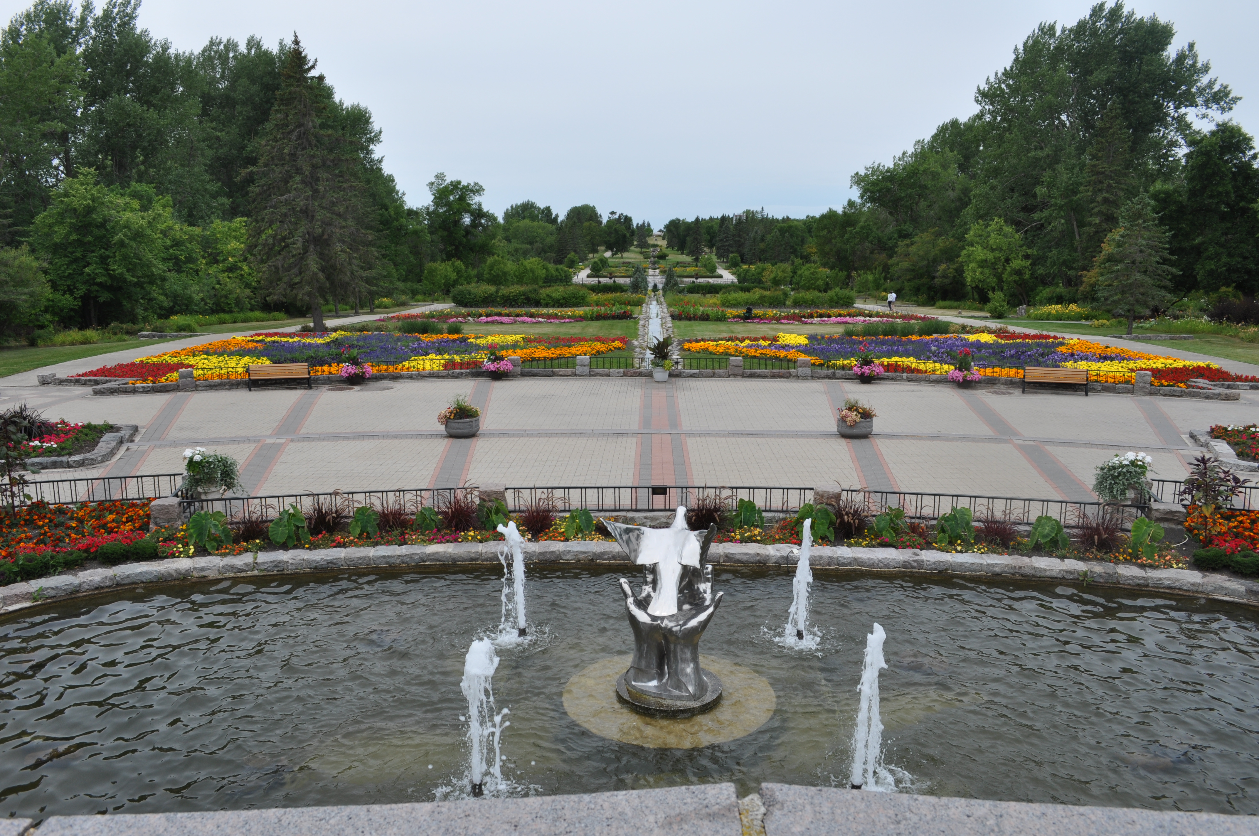 English: A view of the fountain and flower gardens. The central division divides Canada (right) from the USA (left). |