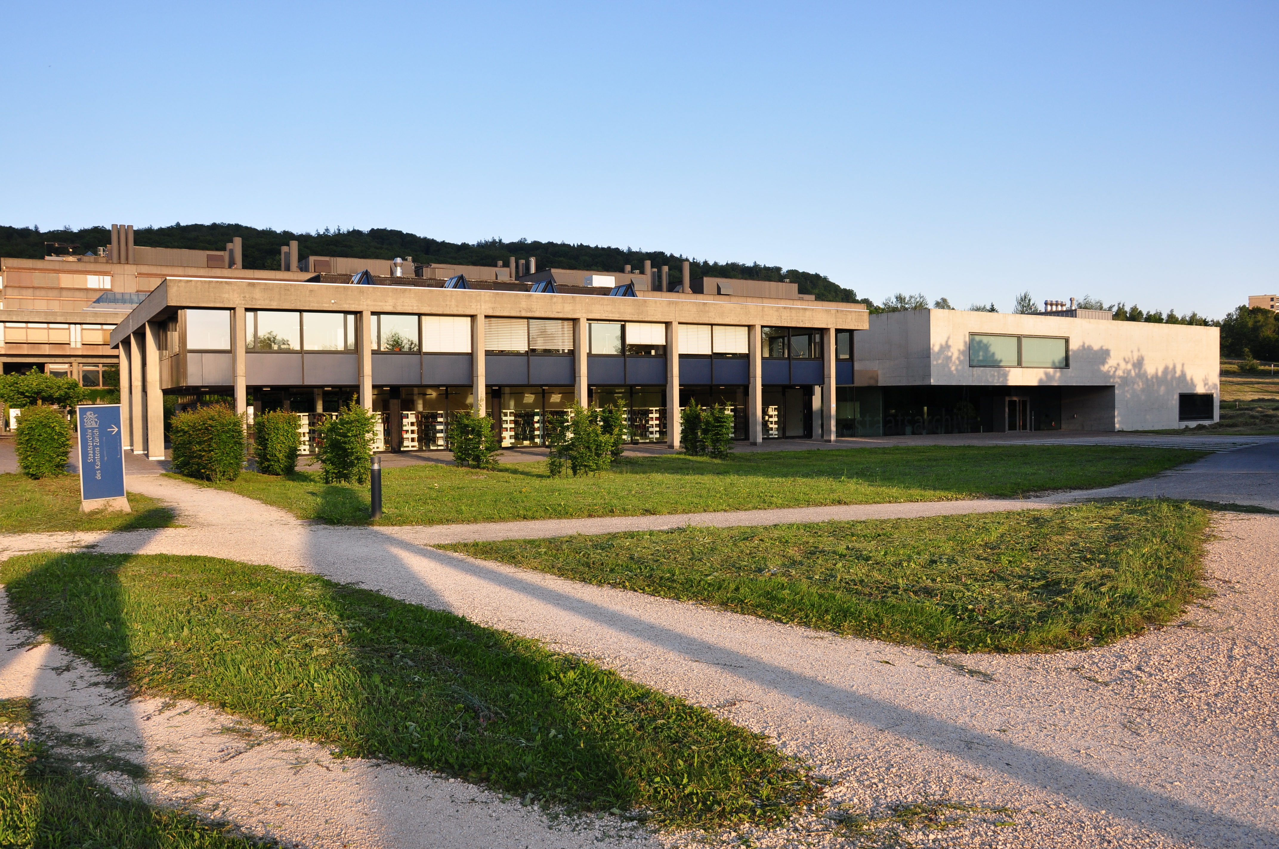 Deutsch: Zürich-Oberstrass : Das Hauptgebäude (rechts) des Staatsarchivs des Kantons Zürich auf dem Gelände der Universität Zürich Irchel im Irchelpark. English: Zürich-Oberstrass : Staatsarchiv (Archives of the Canton of Zürich) at Irchel campus of the University of Zürich. |