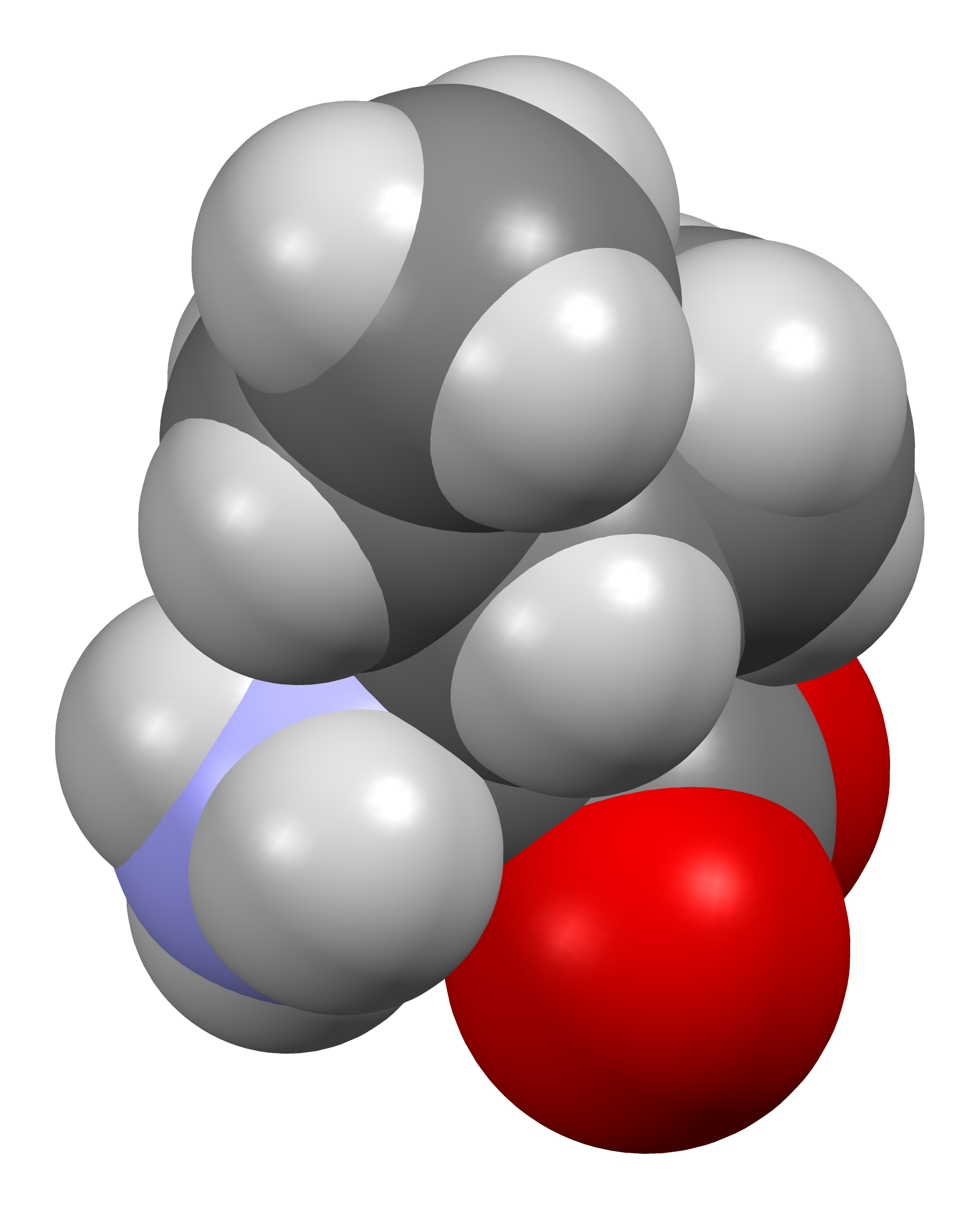 Space-filling model of the L-isoleucine molecule, C6H13NO2, in the zwitterionic form found in the crystal structure determined by powder X-ray diffraction (PXRD) and reported in Acta Cryst. C (1996), 52, 1464-1466 (CSD entry LISLEU02). Colour code: