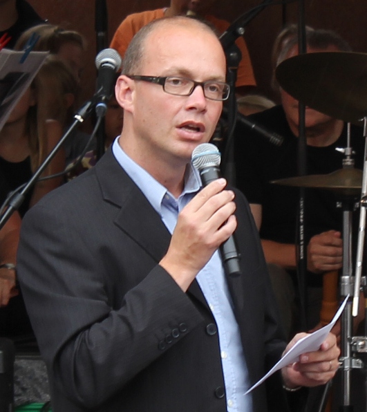 English: Jørn Pedersen was selected as mayor in Kolding,Denmark 2010. On the picture, he is making the opening speech for Kolding CultureNight 2010.