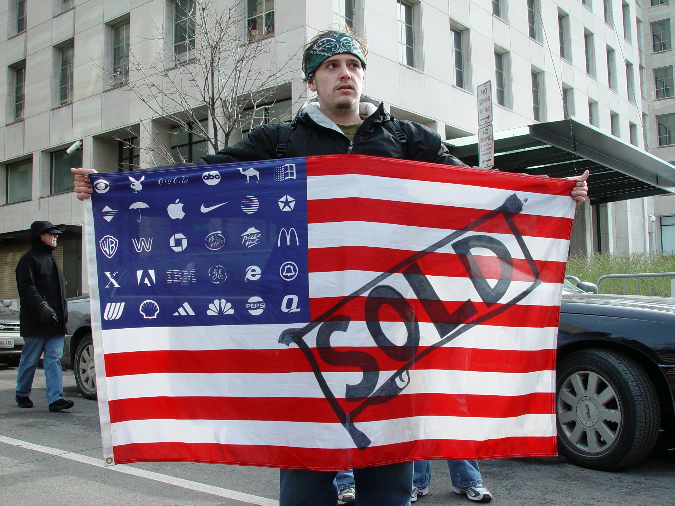 English: Protester holding Adbuster's Corporate American Flag at Bush's 2nd inauguration, Washington DC. |