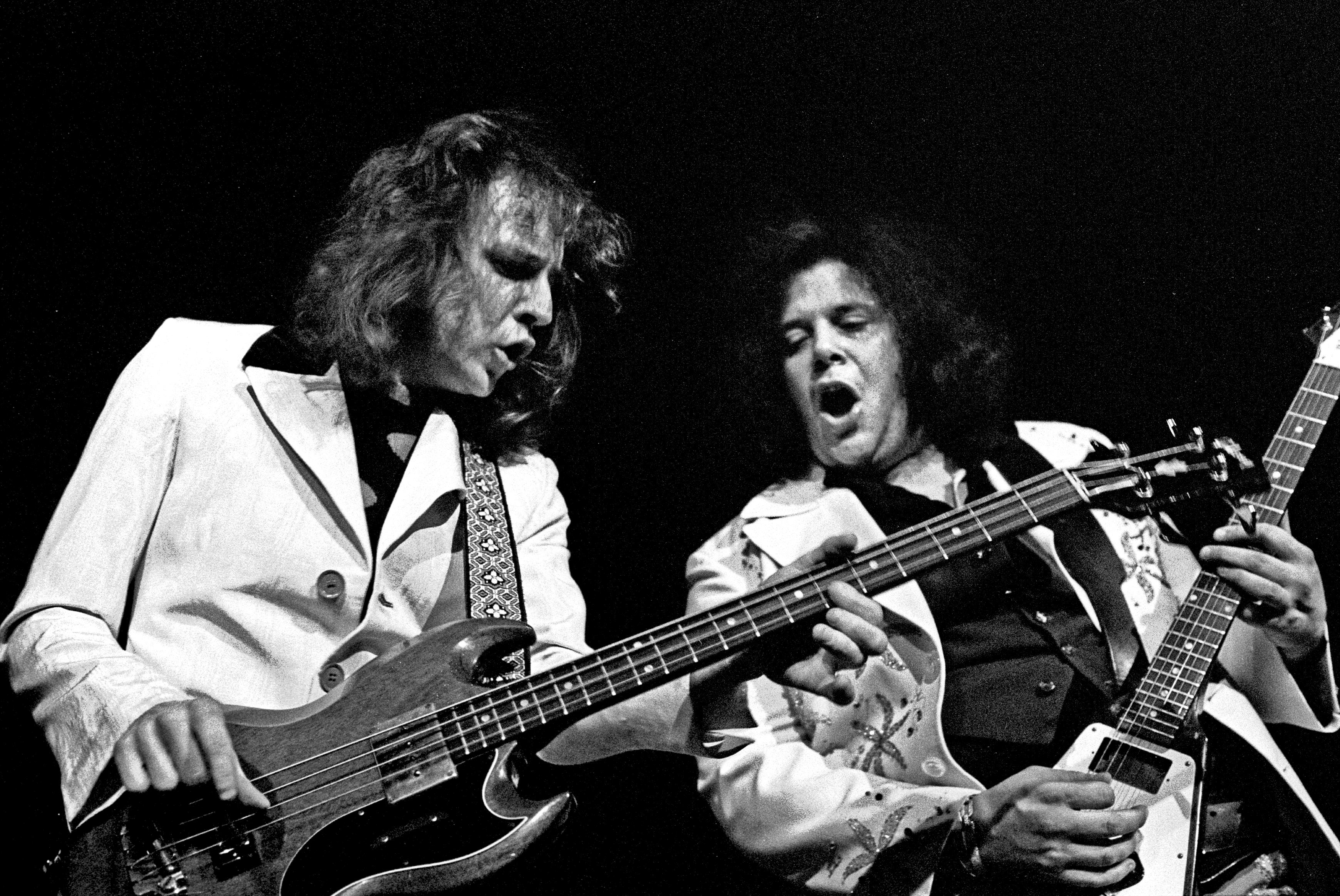 Gescheiterter Anlauf zur Installation einer neuen "Supergroup", aber gute Musik: West, Bruce & Laing, Musikhalle Hamburg, April 1973: Hier Jack Bruce und Leslie West Jack Bruce and Leslie West together, performing as a power trio: West, Bruce & Laing |