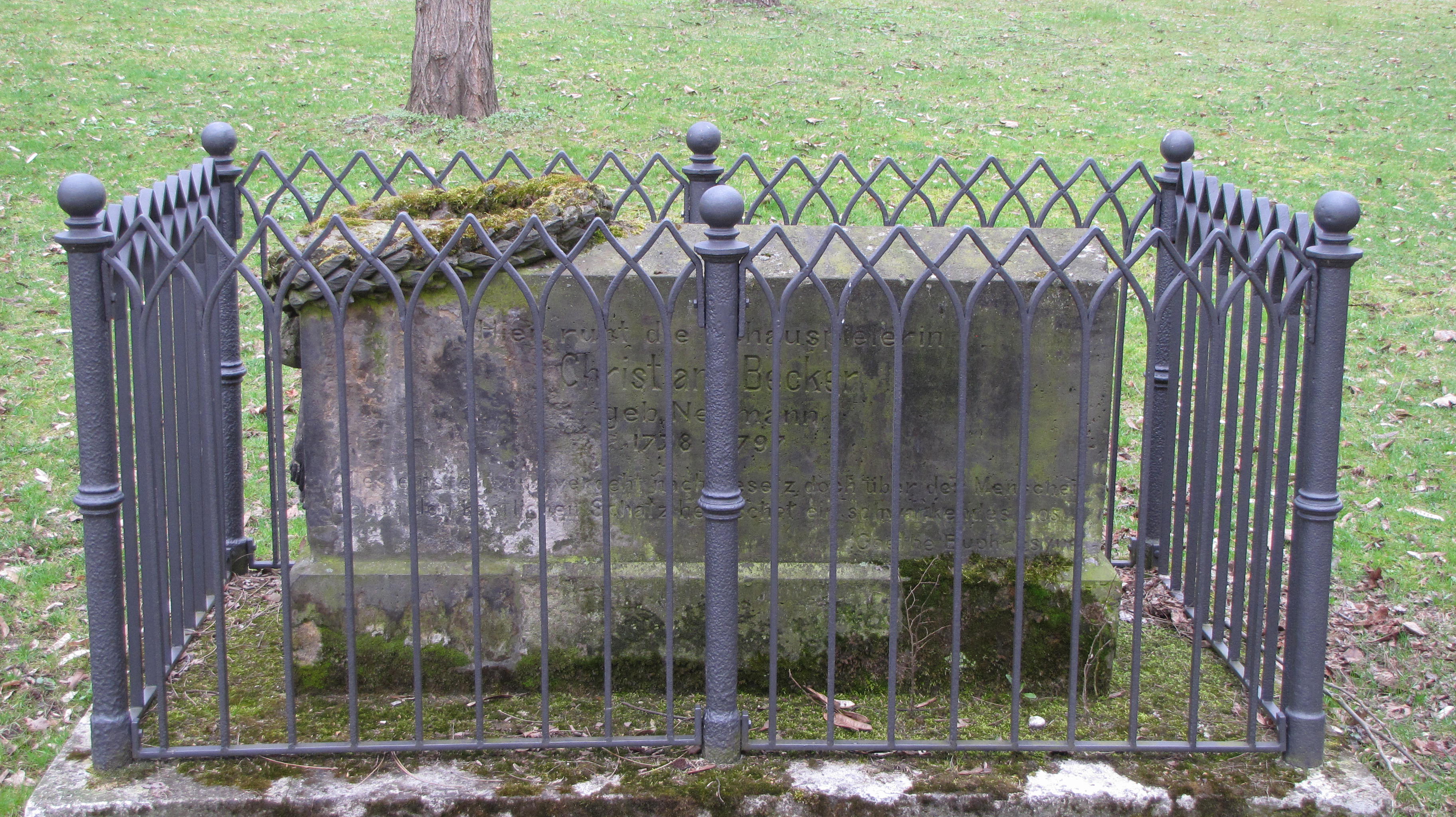 Hier ruht die Schauspielerin Christiane Becker geb. Neumann 1778-1797 Alles entsteht und vergeht nach Gesetz, doch über des Menschen Leben, dem köstlichen Schatz, herrschet ein schwankendes Los. Goethe Euphrosyne |