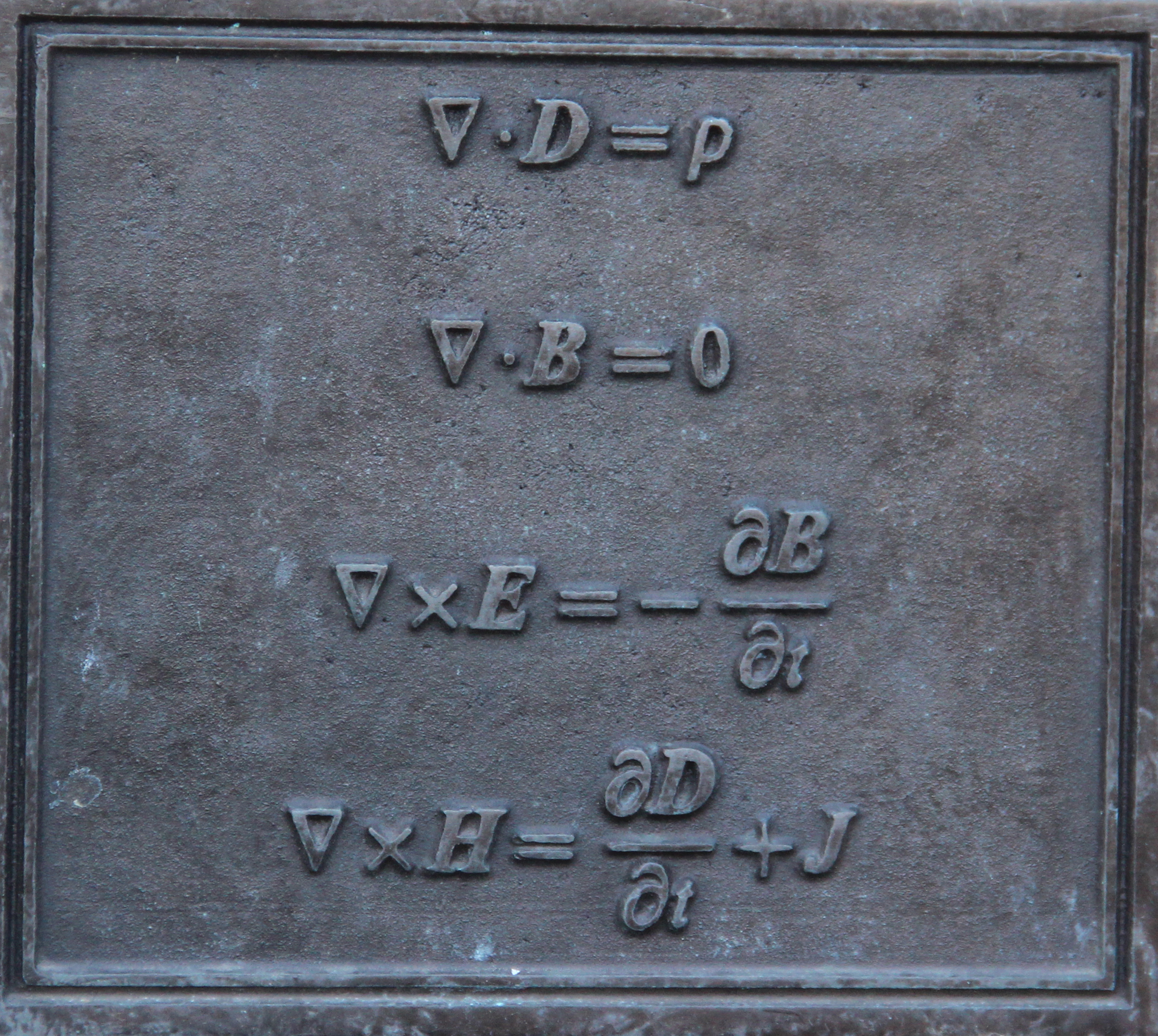English: Plate detailing equations affixed to rear of plinth on which statue of James Clerk Maxwell statue sits. |