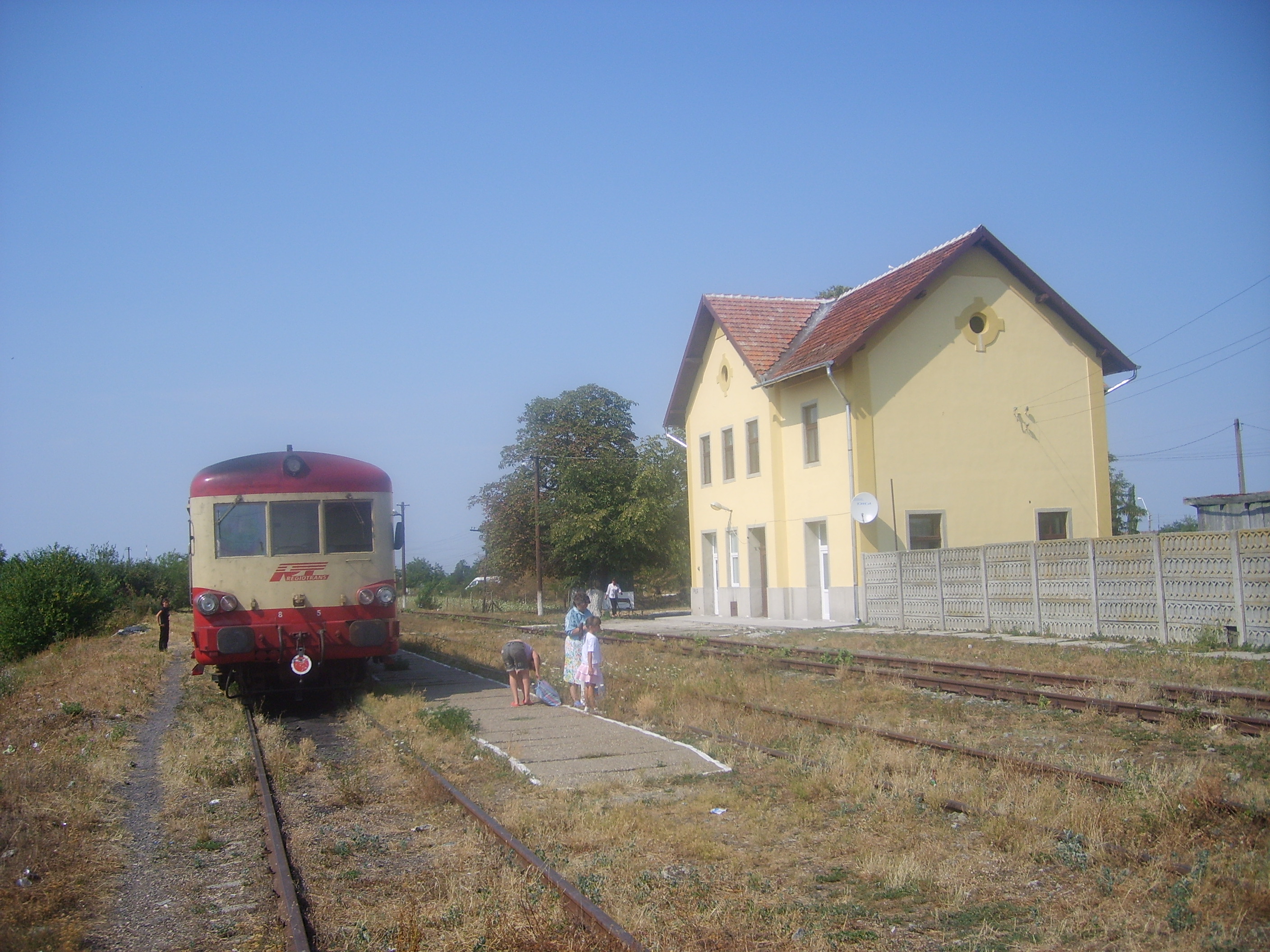 English: Train station in Jamu Mare, Romania, with a passenger train of Regiotrans en route from/to Gătaia. |