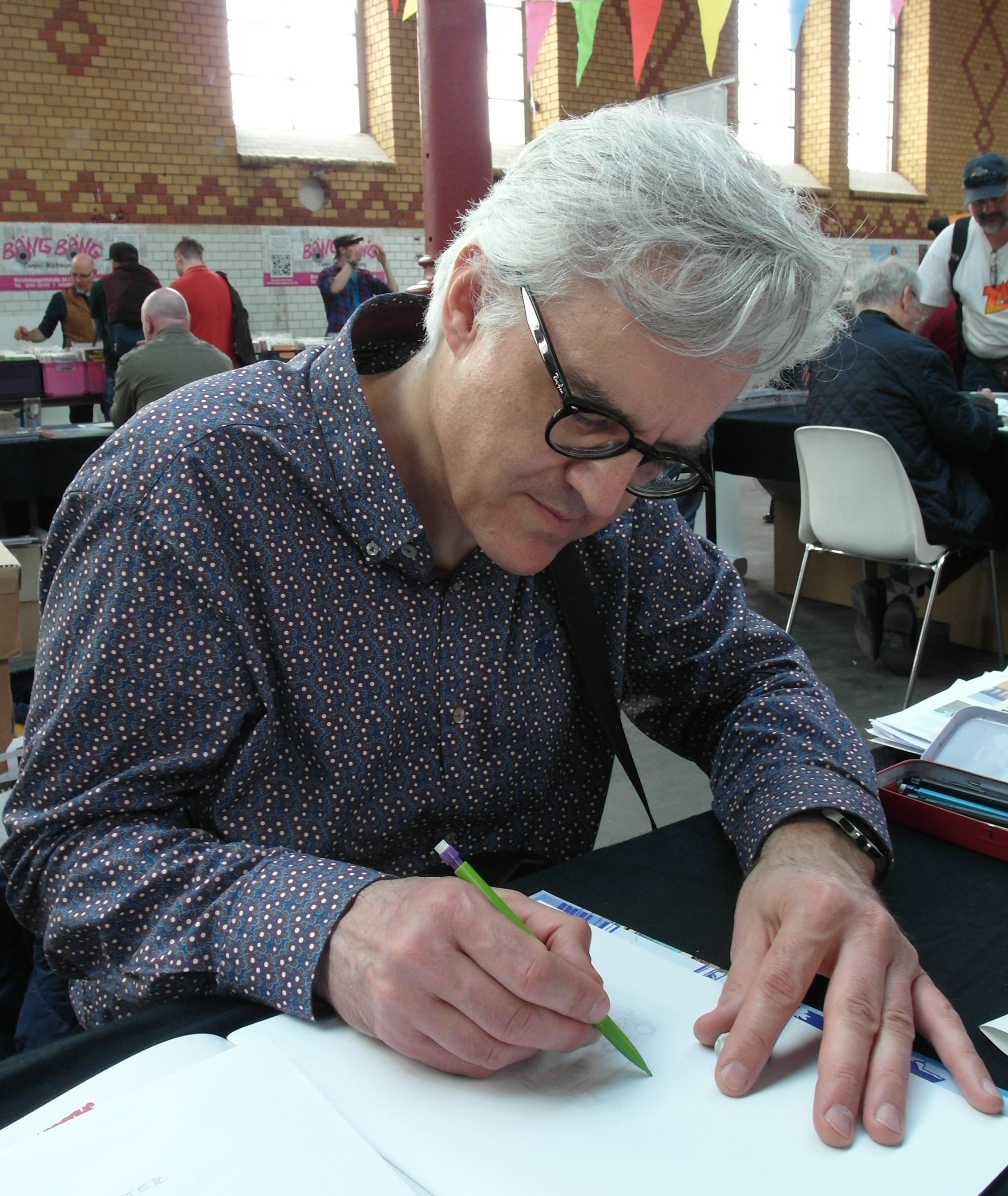 Deutsch: Jean-Luc Delvaux, belgischer Comiczeichner, beim Signieren auf der COMICIADE 2018 in Aachen Français : Jean-Luc Delvaux, auteur belge de bande dessinée, dessine à la Comiciade 2018 à Aix-la-Chapelle |