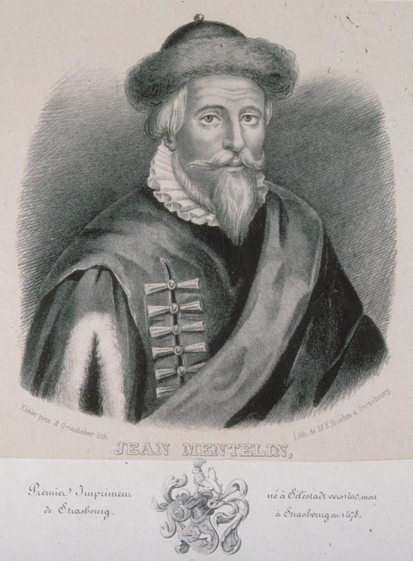 Français : Jean Mentelin, premier imprimeur de Strasbourg, né à Sélestat en 1410 env. mort à Strasbourg en 1478. Strasbourg : M.F. Bœhm (lithographe), 1850. 39,5 x 29,2 cm |
