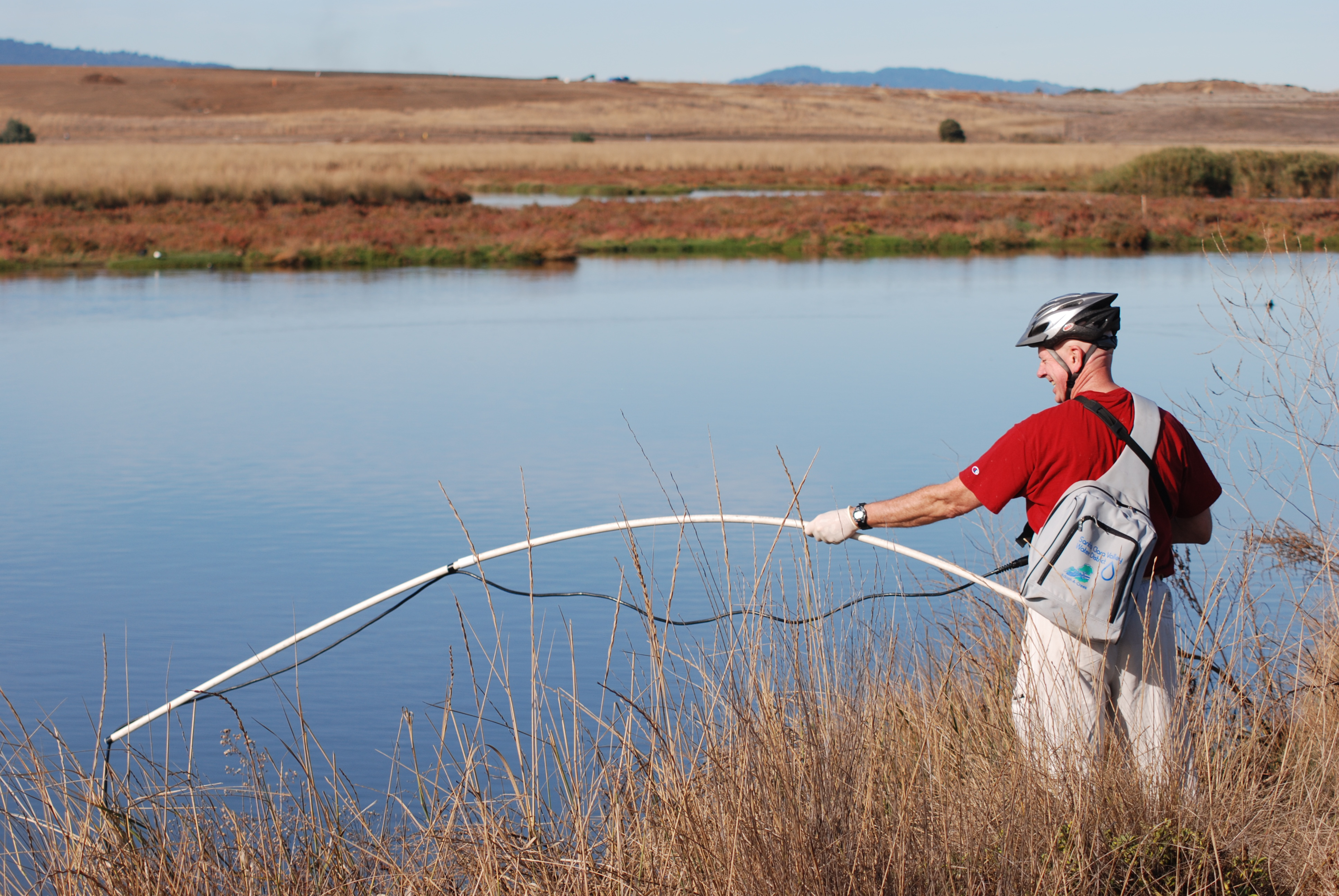 English: Photo of Jim McCarthy, Adobe Creek Streamkeeper, taking water samples to measure dissolved oxygen in Reach 1 of the creek in the Palo Alto Flood Basin.