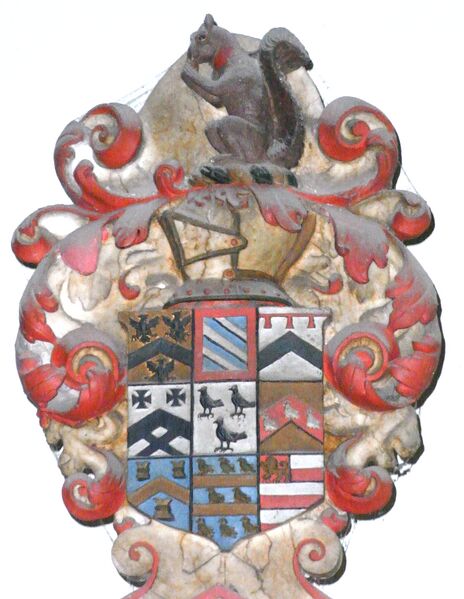 English: Escutcheon above monument to Sir John Bluett (d.1634) in Holcombe Rogus Church, Devon, showing quarterings of heiresses joined to the Bluett family. The heraldic escutcheon on John Bluett's monument shows 8 quarterings as follows, which demonstrate his ancestry from heraldic heiresses: