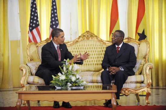 English: US President Barack Obama speaks with Ghanaian President John Atta Mills during a meeting at the Presidential Castle in Accra, Ghana 11 July 2009. |