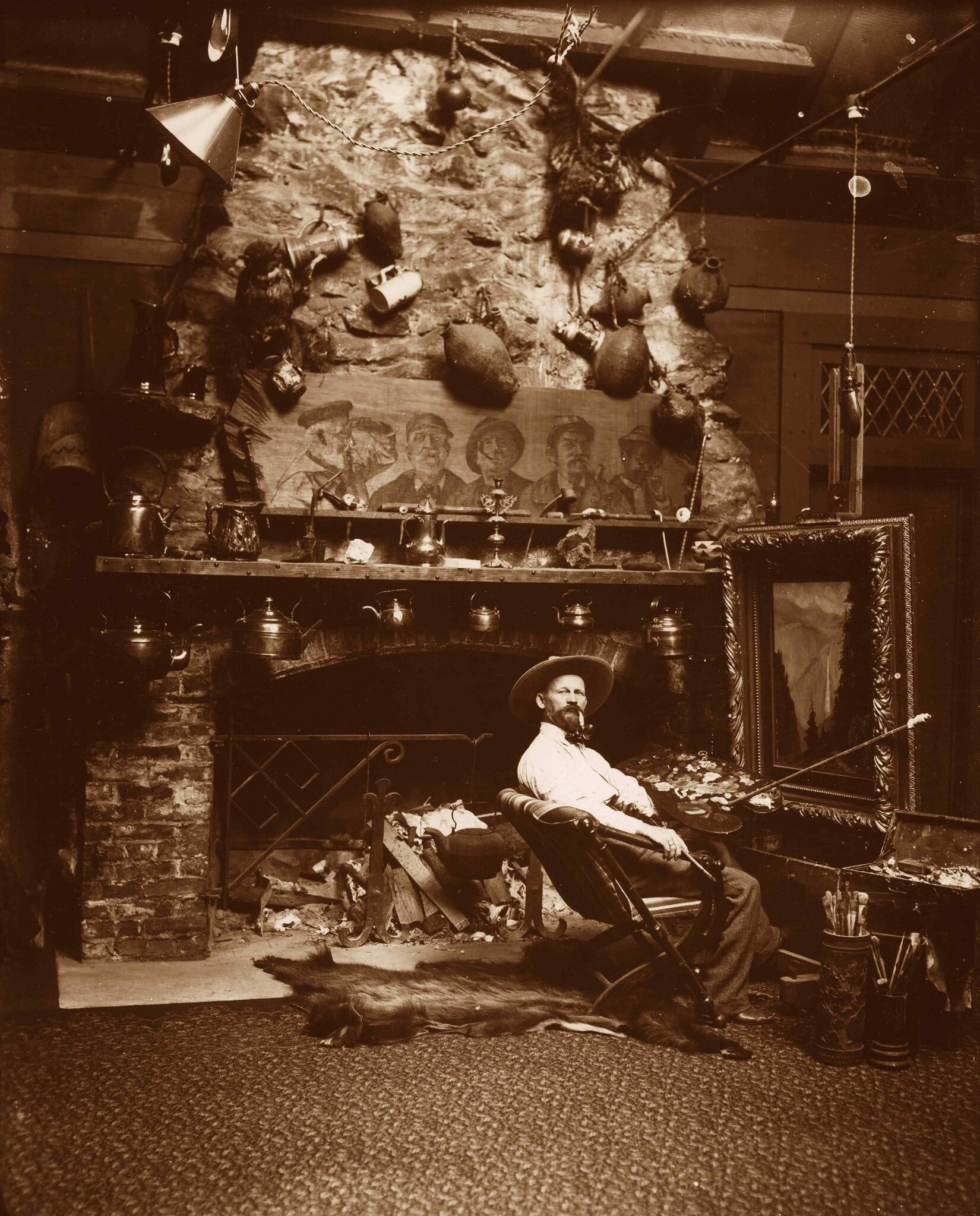 Yosemite Museum Collection 10243. Shows California artist Chris Jorgensen in his Yosemite studio in front of the fireplace--easel up in front of the chair he is sitting in--mantel of fireplace decorated with the figures of men and various size teakettles and mugs. |
