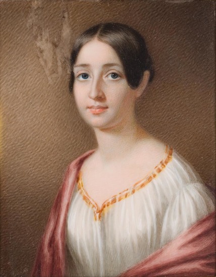 Portrait Miniature - Julia Tallmadge Noyes Object Number ca1910-01-5 Description Subject is shown full face, slightly to left, with black hair parted in middle and dropped down sides and over ears. Blue eyes. She wears white off the shoulder dress and a red shawl. Subject is the granddaughter of Colonel Benjamin Tallmadge. Her bust is located in the museum. Category Communication Artifacts Maker Baker, George Augustus, 1821-1880 Date Made 1841 Dimensions 3 1/2" H x 2 3/4" L Materials ivory watercolor |