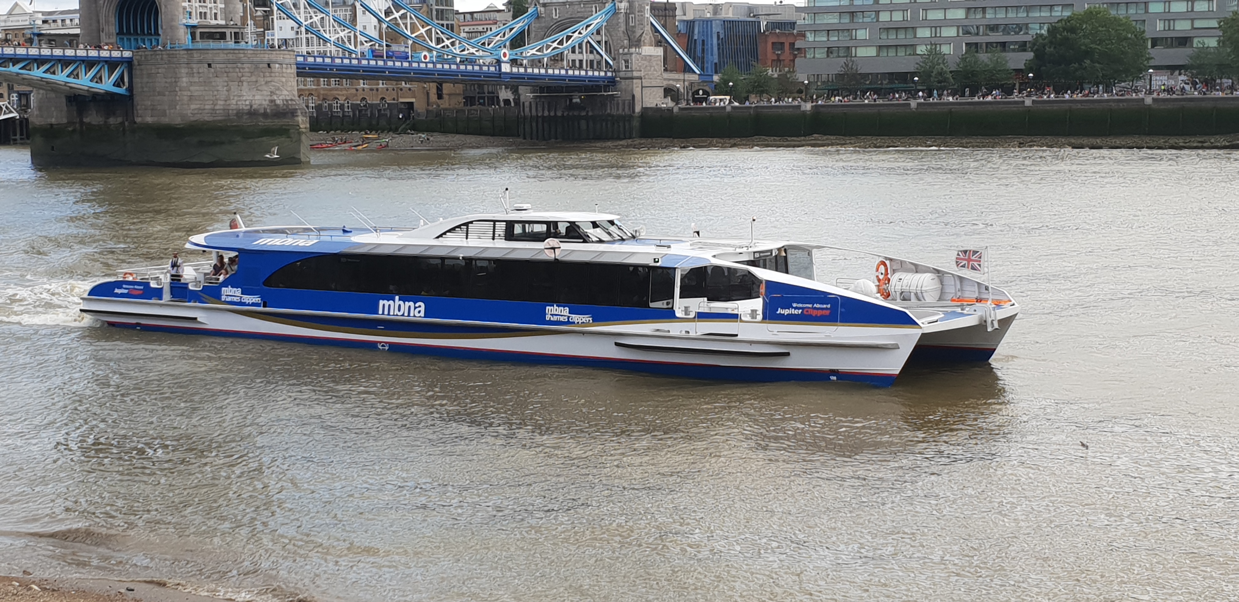 English: Thames Clipper vessel Jupiter Clipper approaching Tower Pier having passed under Tower Bridge on the River Thames in central London. |