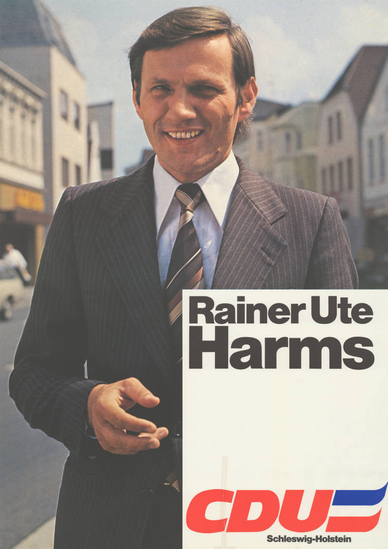 Rainer Ute Harms CDU Schleswig-Holstein Abbildung: Foto Plakatart: Kandidaten-/Personenplakat mit Porträt Auftraggeber: Verantw.: CDU Schleswig-Holstein Objekt-Signatur: 10-012 : 419 Bestand: Landtagswahlplakate Schleswig-Holstein (10-012) GliederungBestand10-18: Landtagswahlplakate Schleswig-Holstein (10-012) » Landtagswahl am 29.4.1979 » Ankündigungsplakate Lizenz: KAS/ACDP 10-012 : 419 CC-BY-SA 3.0 DE |