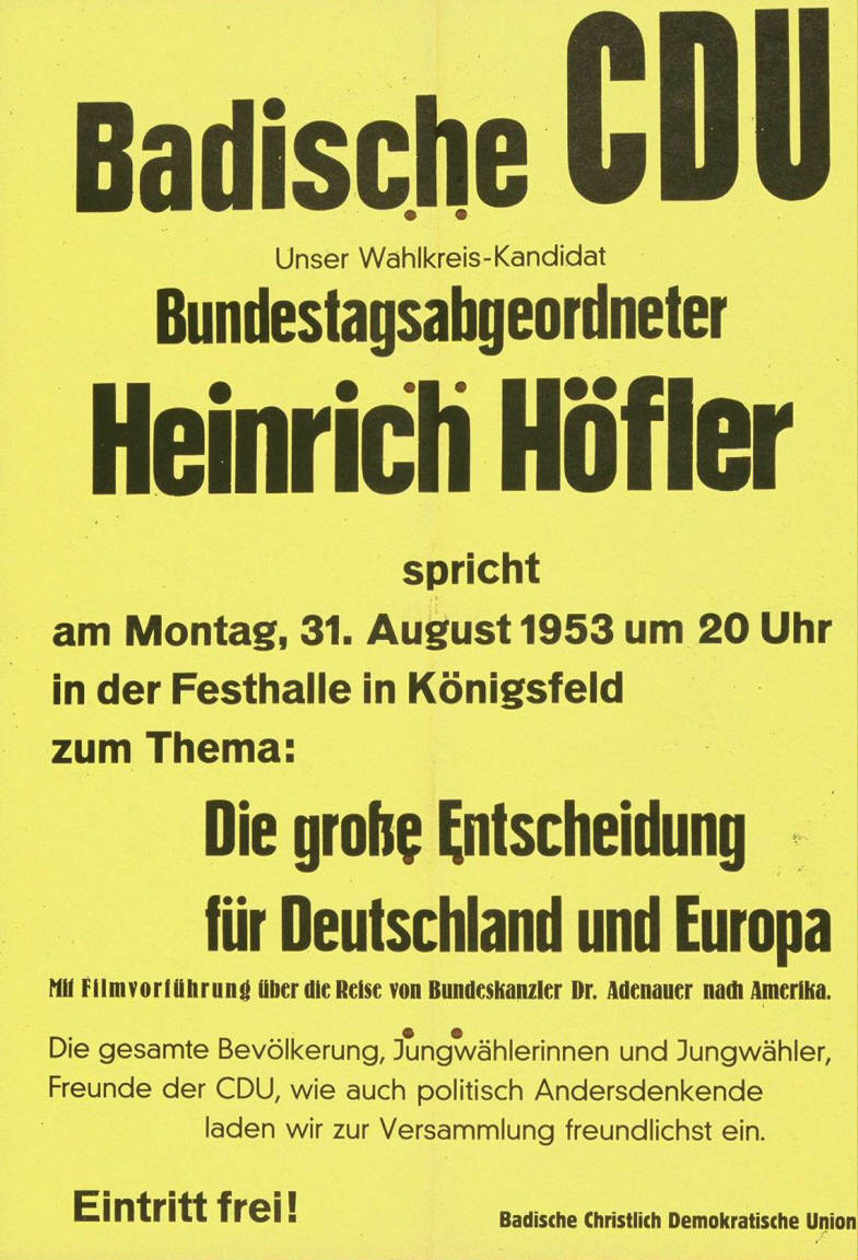 Badische CDU Unser Wahlkreis-Kandidat Bundestagsabgeordneter Heinrich Höfler spricht ... zum Thema: Die große Entscheidung für Deutschland und Europa Mit Filmvorführung über die Reise von Bundeskanzler Dr. Adenauer nach Amerika. ... Plakatart: Ankündigungsplakat Auftraggeber: Badische Christlich Demokratische Union Drucker_Druckart_Druckort: Plakatdruck Artur Kratzer, Donaueschingen Objekt-Signatur: 10-001: 561 Bestand: Plakate zu Bundestagswahlen (10-001) GliederungBestand10-18: Plakate zu Bundestagswahlen (10-001) » Die 2. Bundestagswahl am 6. September 1953 » CDU » Ankündigungsplakate Lizenz: KAS/ACDP 10-001: 561 CC-BY-SA 3.0 DE |