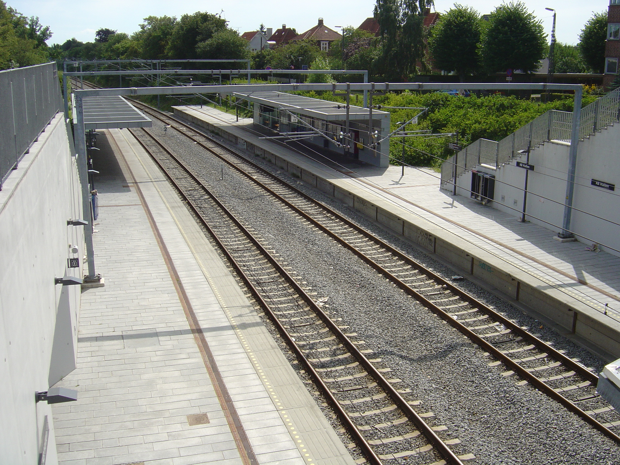 English: KB Hallen station is a train station on Frederiksberg, Copenhagen. Seen from the northern side, on the bridge next to Peter Bangs Vej.