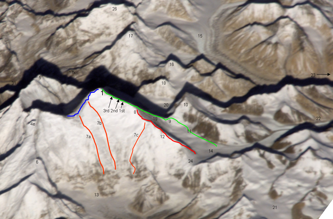 | orange line 7c | “Phantasy Ridge” (acc. to a speech of George Mallory), no successful ascent until 2008, tried by Cathy O’Dowd and Ian Woodall; they came half way to NE ridge & Pinnacles |