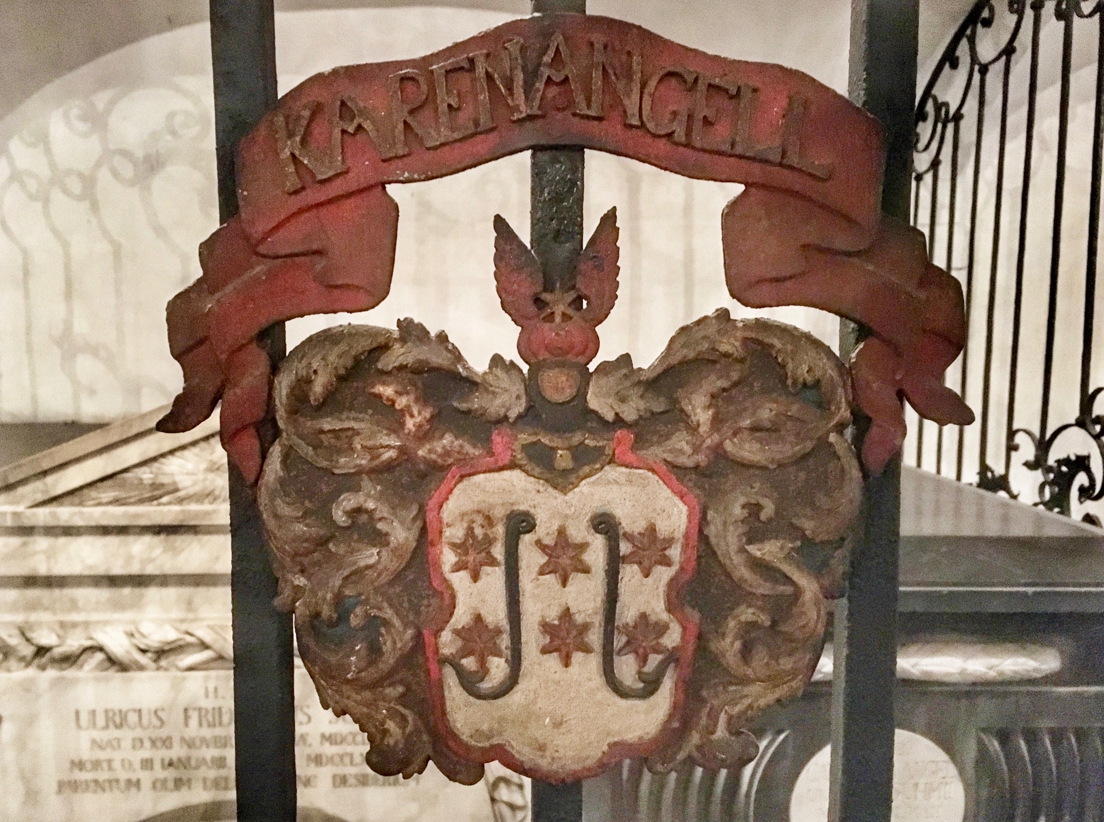 Karen Angells våben på gitterport til kapel 25 i Christian Kirkes gravkammer: udelt, hvidt skjold med to blå fiskekroge, flankeret og skilt af tre gange to røde stjerner. Skjoldet er indrammet i rødt. Over våbnet rødt bånd med forgyldt indskrift: Karen Angell. Se Danmarks Kirker 1, bind 4. |