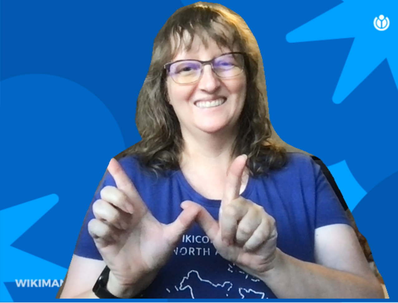 English: User KarenJoyce is smiling and forming a letter W with her thumbs and forefingers.