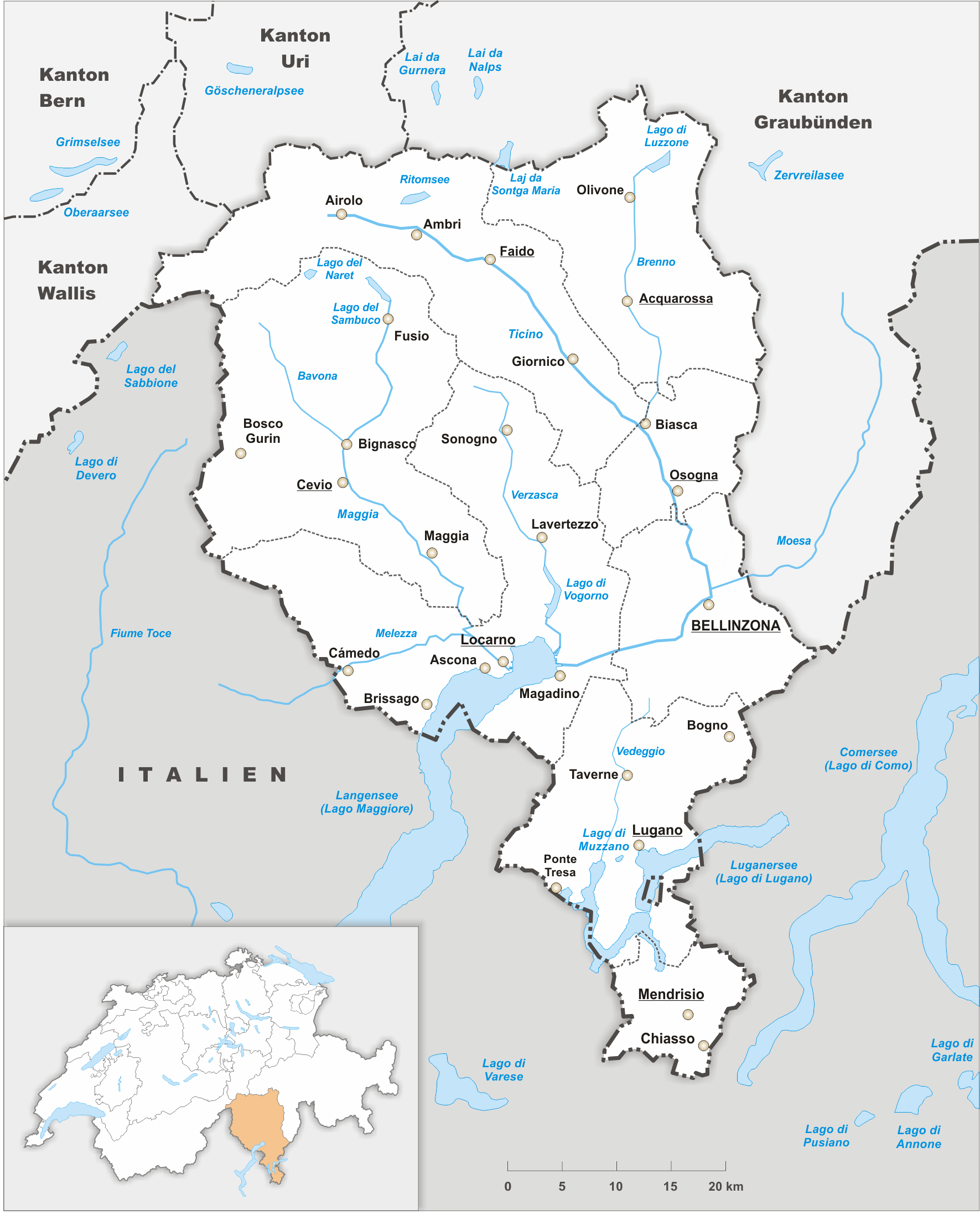 Deutsch: Karte des Kanton Tessin. |