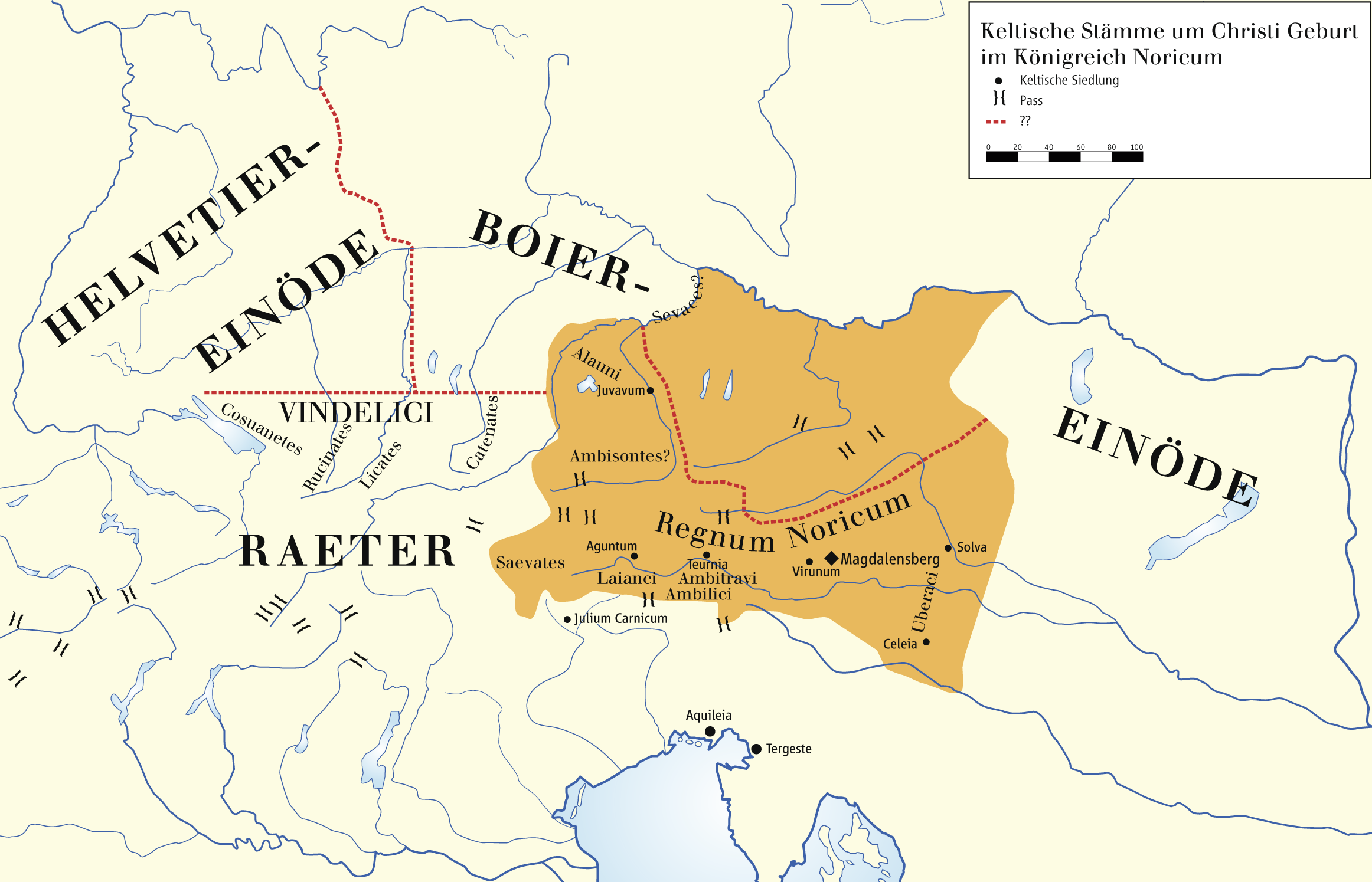 Deutsch: Keltische Stämme um Christi Geburt im Königreich Noricum (Kärnten / Steiermark / Oberösterreich in Österreich / Europäische Union. Bezeichnungen auf der Karte: Helvetier-Einöde, Boier-Einöde, Raeter, Vindelici, Alauni, Ambisontes, Regnum Noricum, Laianci, Ambidravi, Ambilici, Uberraci, Cosuanetes, Rucinates, Licates, Catenates, Juvavum, Sevaecs, Aguntum, Teurnia, Virunum, Magdalensberg, Solva, Julium Carnicum, Aquileia, Tergeste) |