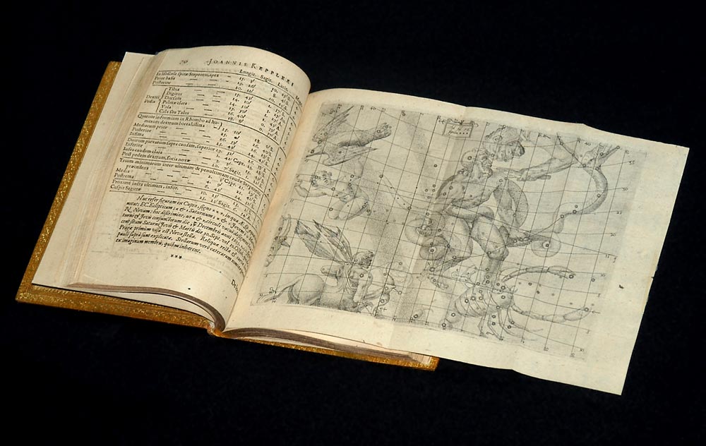 English: Johannes Kepler's De Stella Nova (1604), open to the foldout starmap placing the supernova of 1604 in context. |
