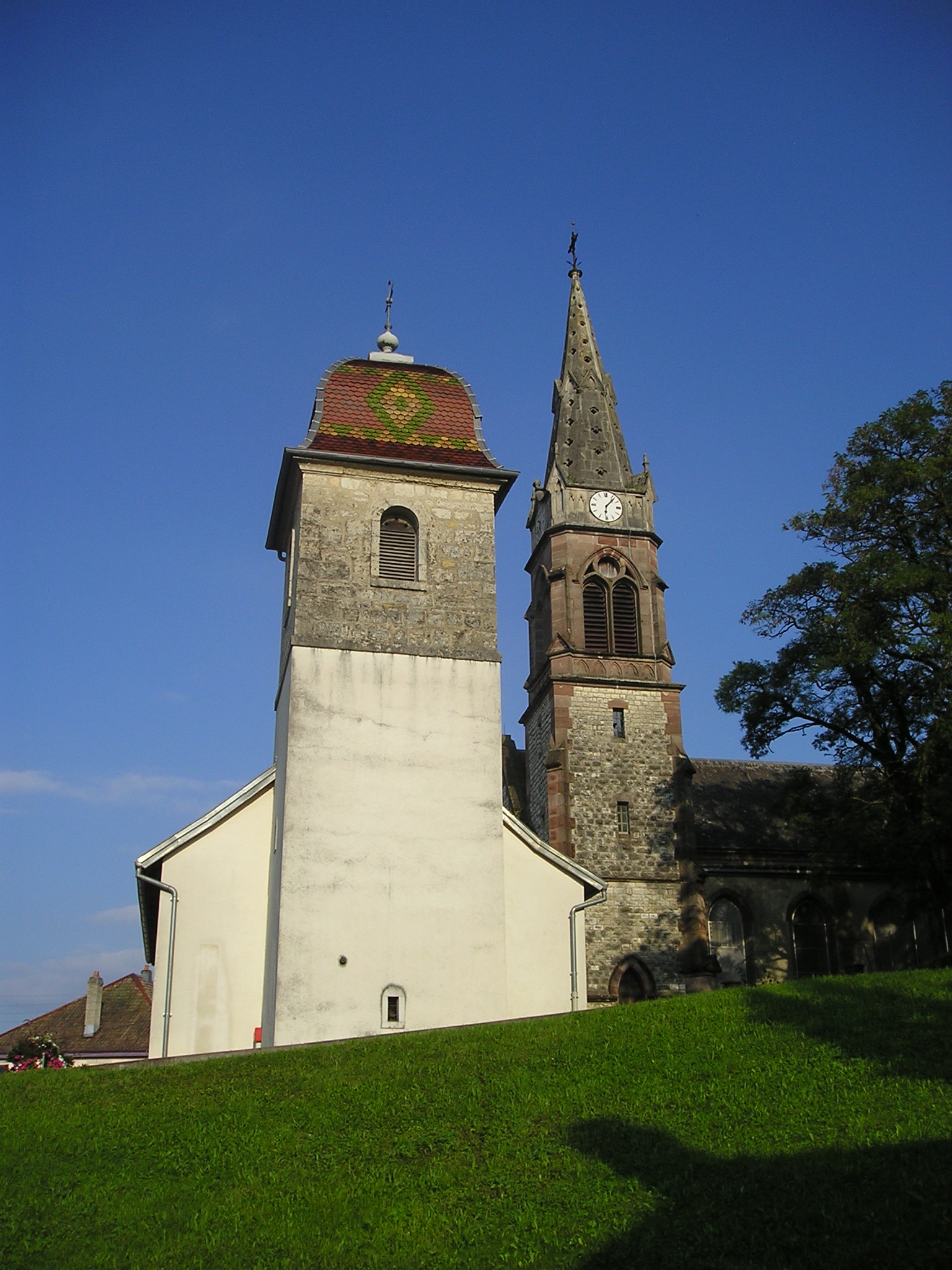 Deutsch: Türme der lutherischen Alten Kirche (Vieille église; links) und der neuen lutherischen Kirche (Temple luthérien; rechts) in Seloncourt |