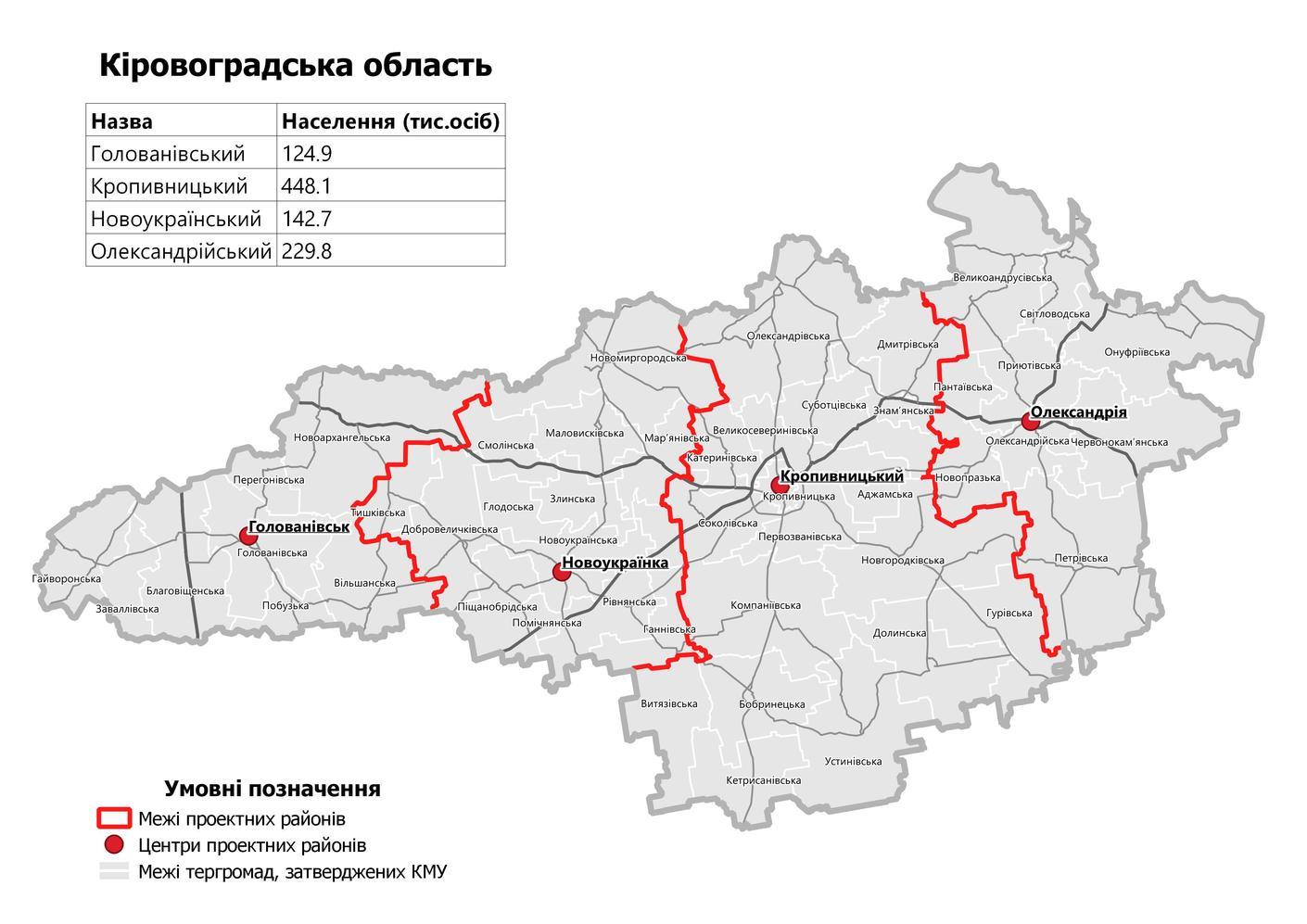 English: Subdivisions of Kirovohrad Oblast, as adopted by the Verkhovna Rada on 17 July 2020. Work of the Ministry of Territorial Development, available as CC-BY 4.0. Raion borders and centers are shown in red, borders of united territorial communities are shown in white. |