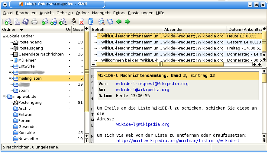 English: Screenshot of the Free Software email programm KMail with "Crystal" icons and "Keramik" widget theme which is part of the K Desktop Environment (KDE) GUI.