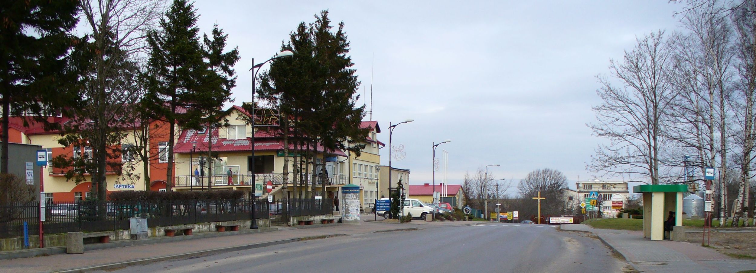Polski: Wieś Kosakowo (województwo pomorskie, powiat pucki, gmina Kosakowo). Ul. Żeromskiego, po lewej budynek Urzędu gminy Kosakowo.