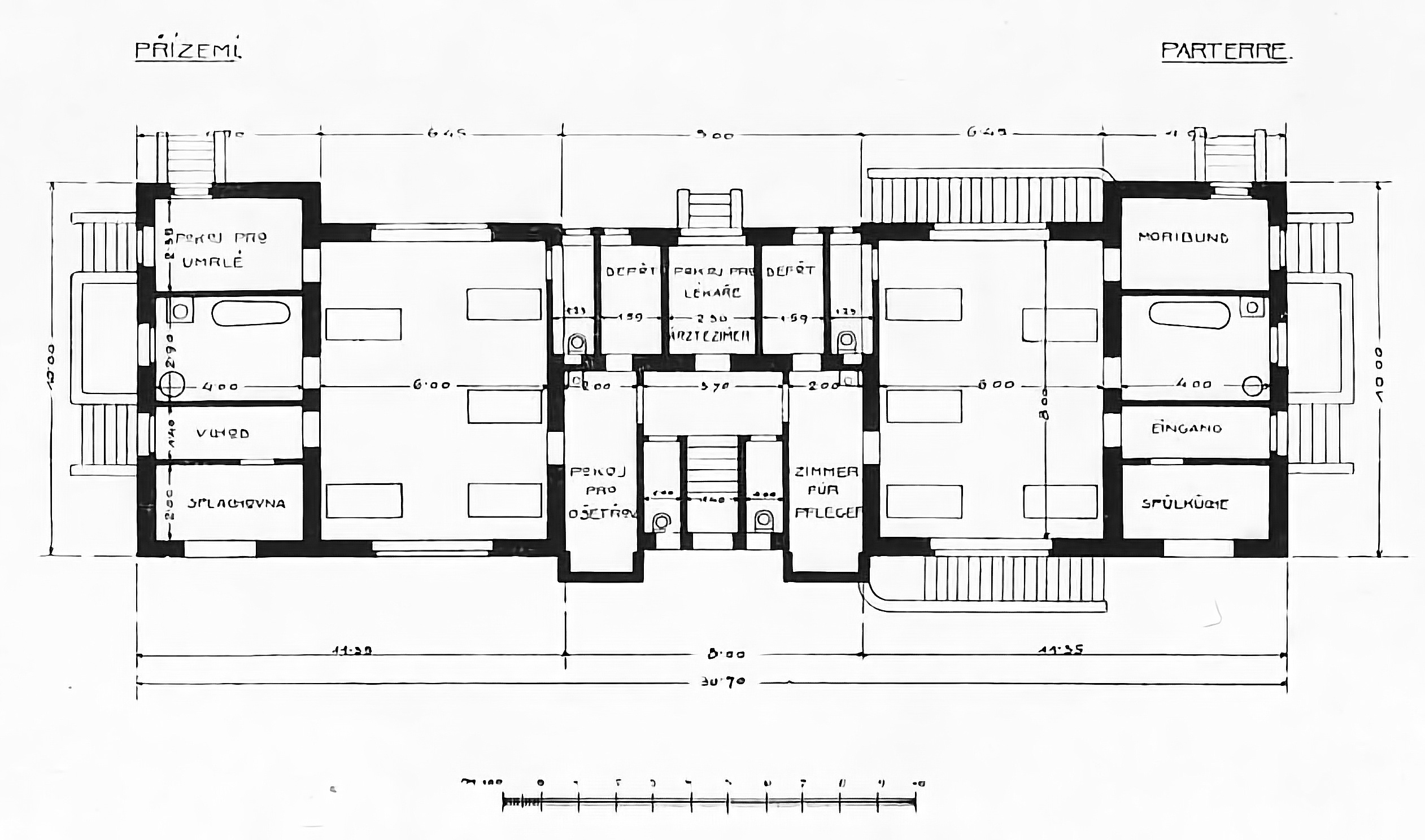 English: floor plan of building »Infektions-Pavillon« at psychiatric hospital »Mährische Kaiser Franz Joseph I. Landes-Heilanstalt Kremsier« (Kroměřiž) |