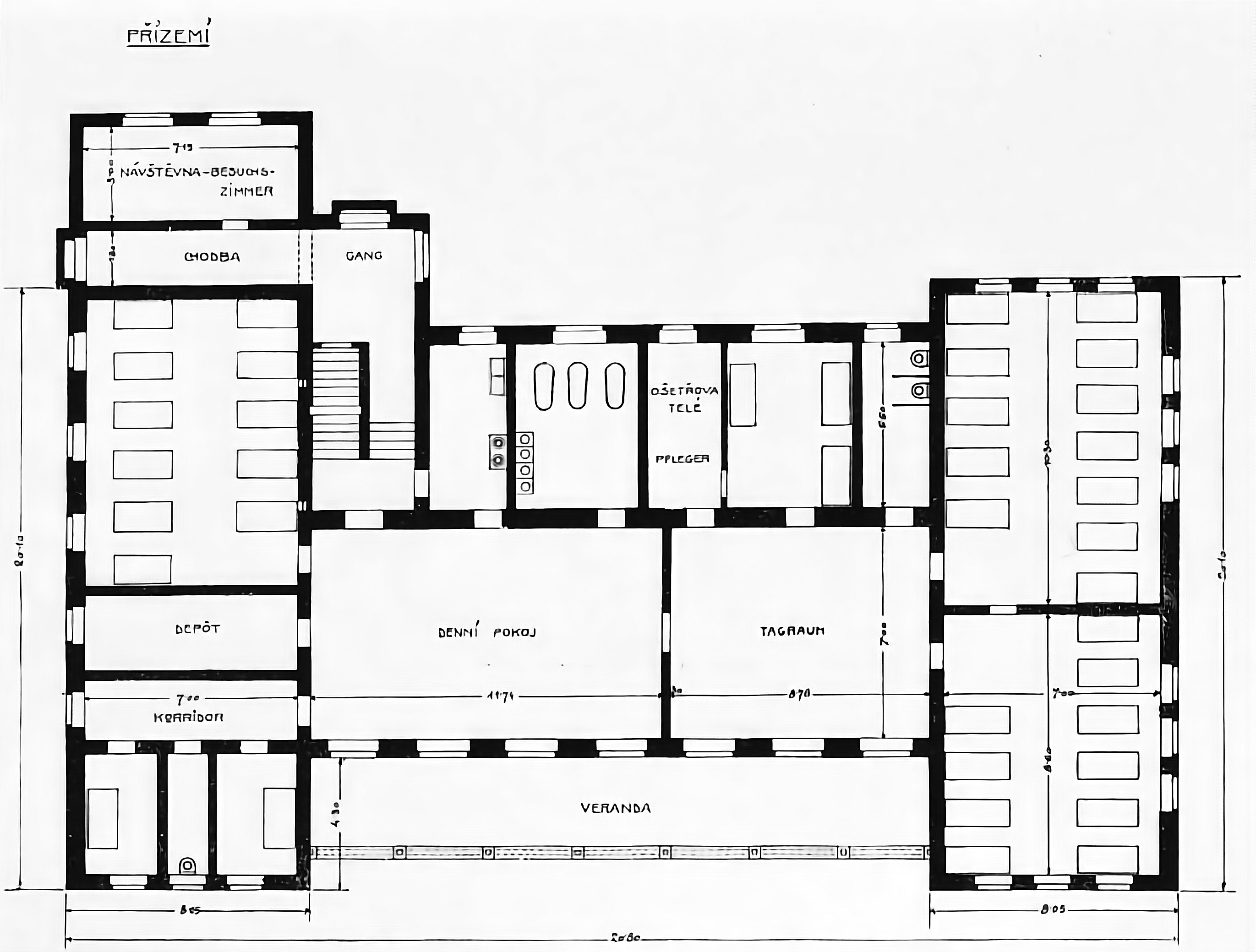 English: floor plan of building »Pavillon für Pflegebedürftige« at psychiatric hospital »Mährische Kaiser Franz Joseph I. Landes-Heilanstalt Kremsier« (Kroměřiž) |