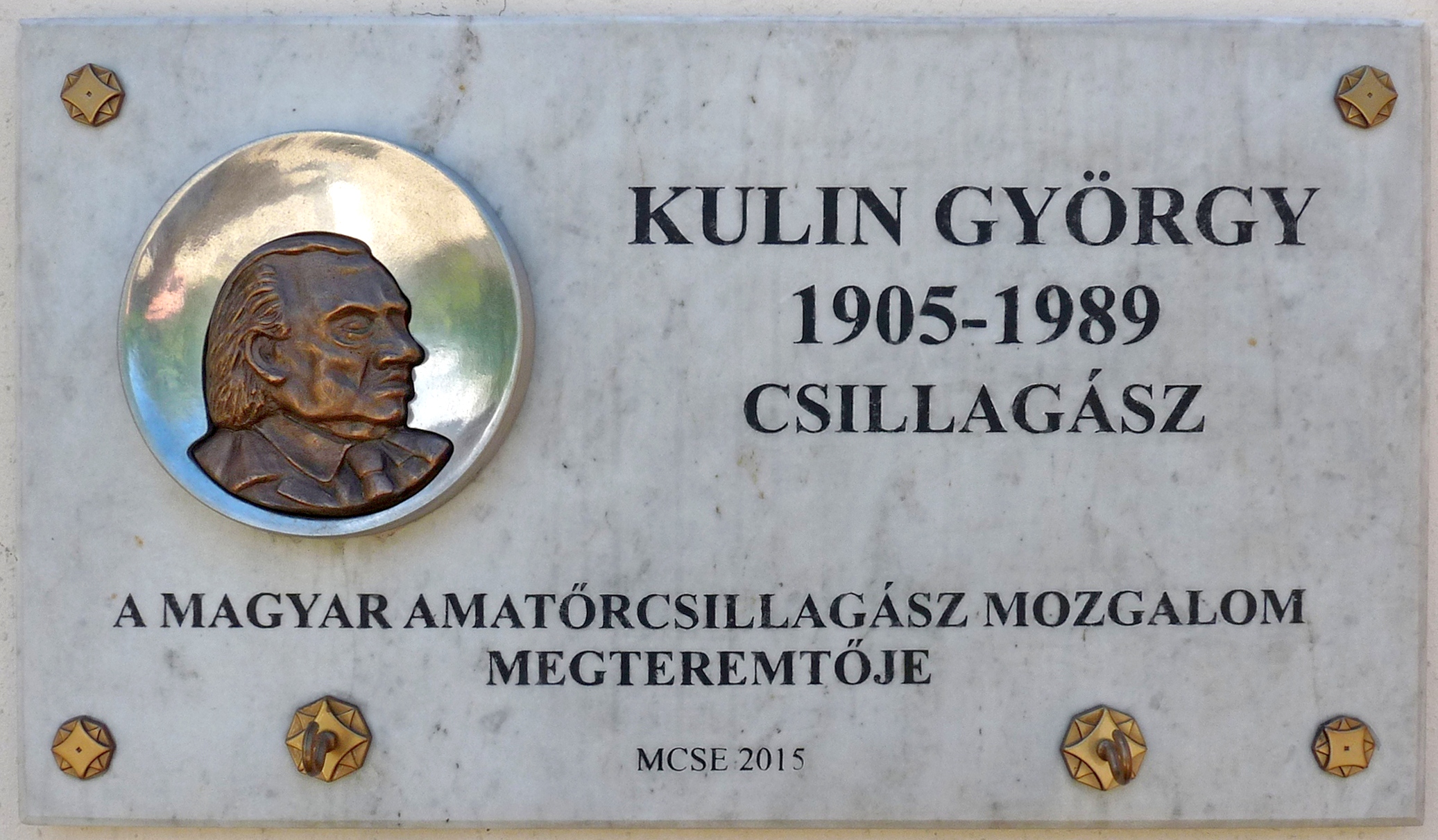 English: Commemorative plaque to Mr. György Kulin (1905–1989) Hungarian astronomer, founder of the amateur astronomy movement in Hungary. It was affixed to the wall of the Polaris Observatory in Óbuda and unveiled on January 28, 2015 on the occasion of the astronomer's 110th birthday. The author of the plaque as well as the bronze relief is Mr. Géza Marton medalist and sundial maker. (Budapest, District III, Laborc Street Nr 2/c)