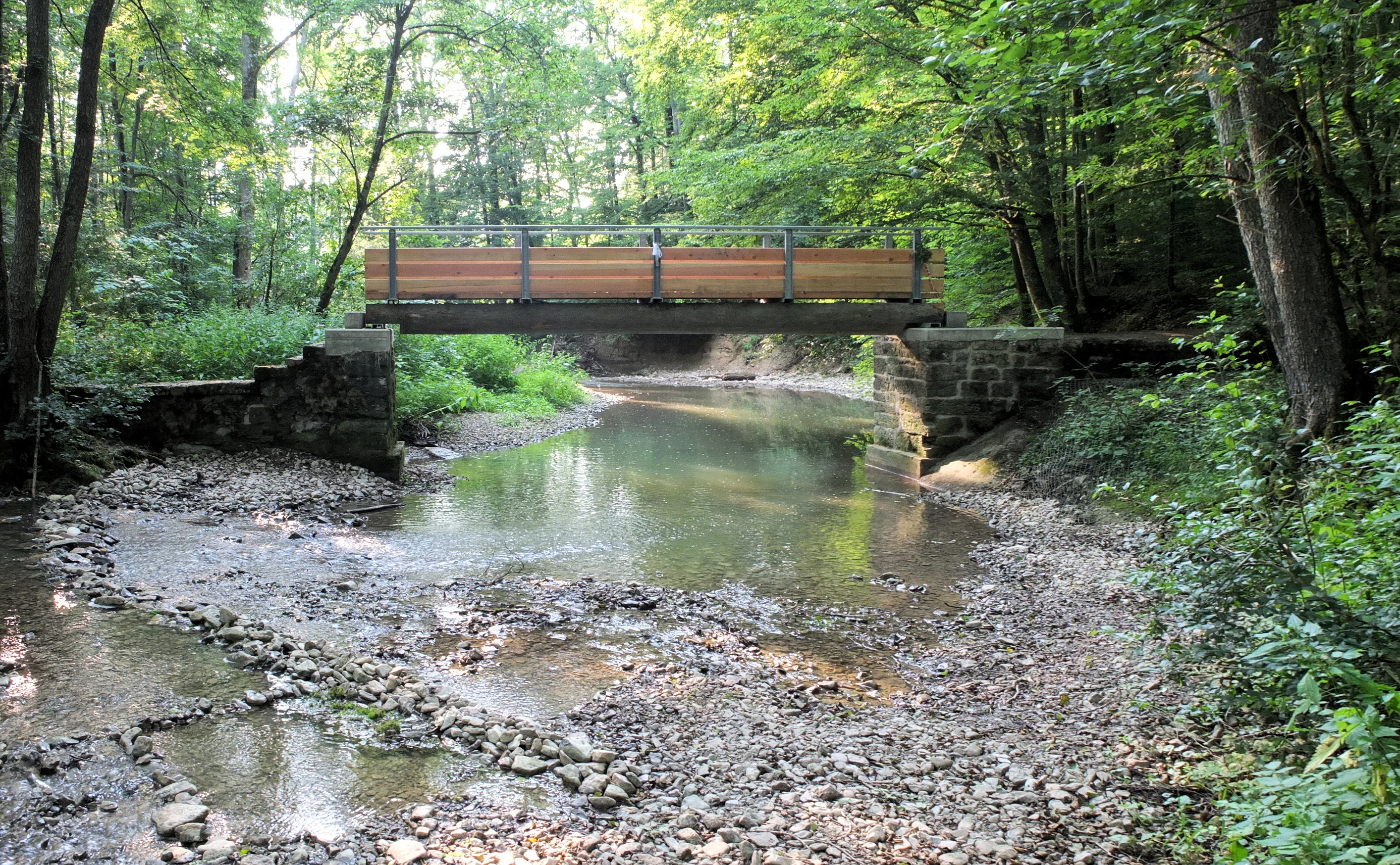 Deutsch: Der Schwarze Steg im Kupfertal nahe Forchtenberg. Diese Brücke über die Kupfer wurde anstelle einer alten Brücke ähnlicher Bauart 2012 neu erbaut. Über sie verläuft der Georg-Fahrbach-Weg. |