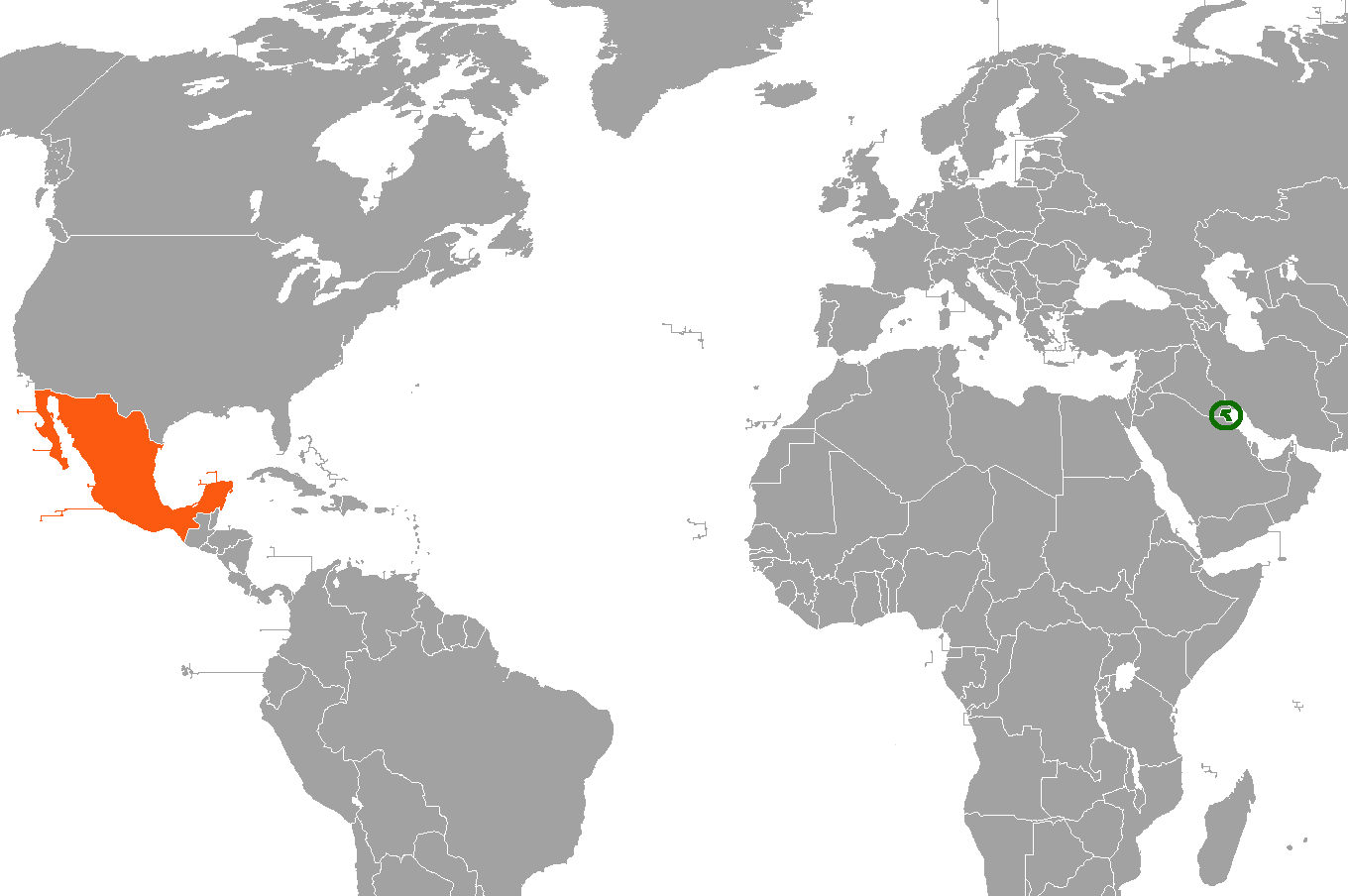 English: Map showing the locations of both Kuwait and Mexico |