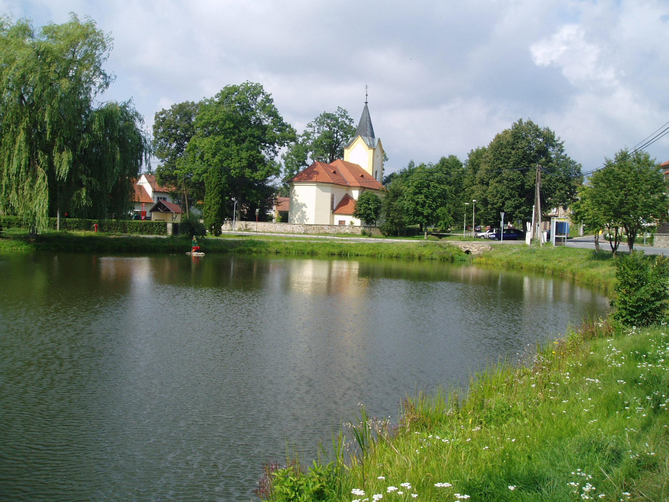 (بالتشيكية) English: Village green in Kytín with the Church of Assumption of Mary, view from the East |