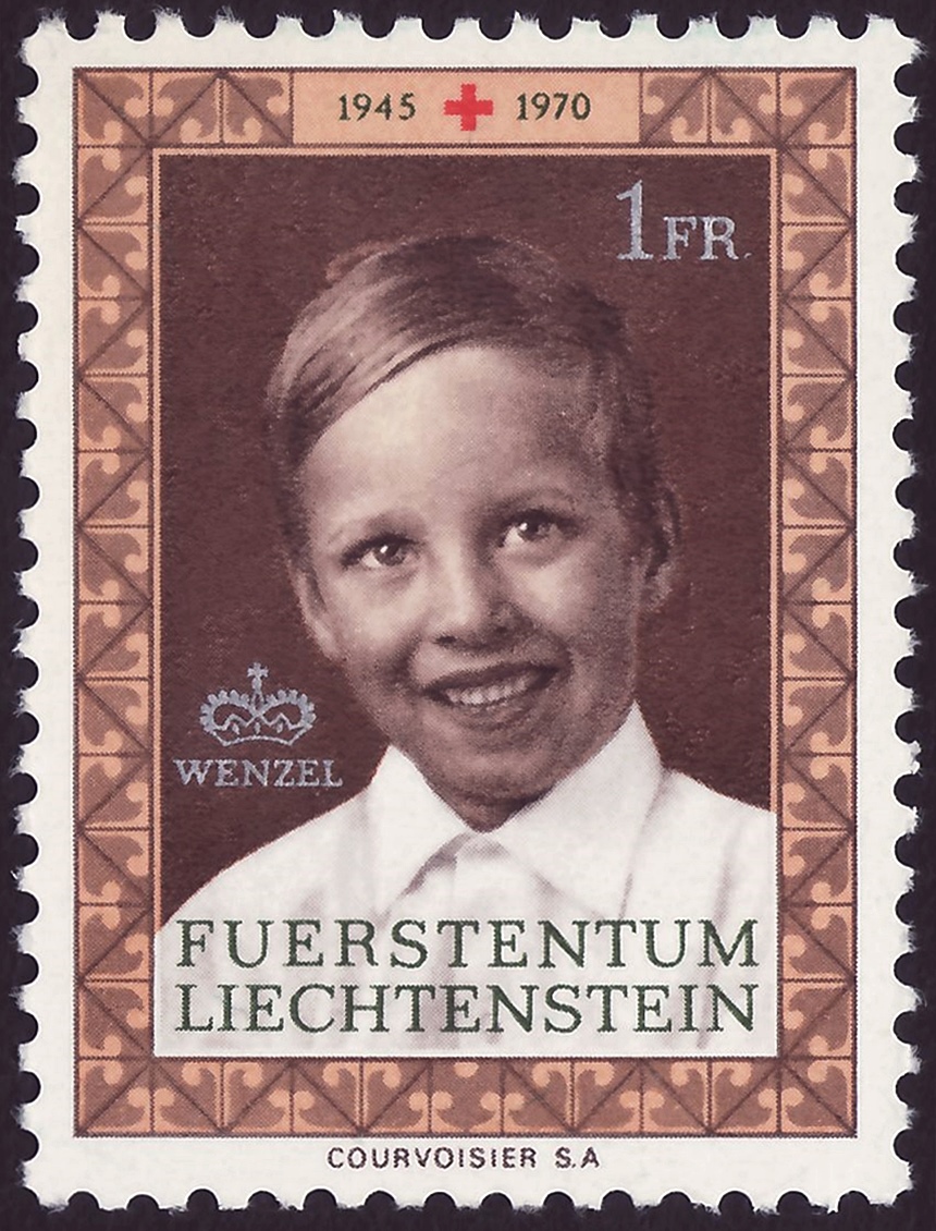 Stamp of the Principality of Liechtenstein; 1970; commemorative stamp of the issue "25th Anniversary of the Red Cross in Liechtenstein"; stamp motive with a portrait of the Prince Franz Josef Wenzeslaus ("Wenzel") of Liechtenstein (1962-1991) with monogram in an ornamented frame; mint stamp |