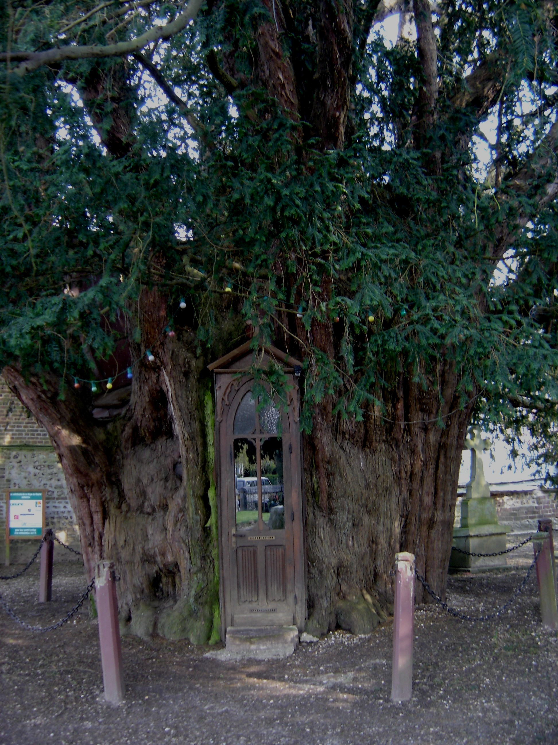 Deutsch: Eibe mit im hohlen Stamm (16m Umfang) integrierter Kapelle auf dem Friedhof von La Haye-de-Routot. |