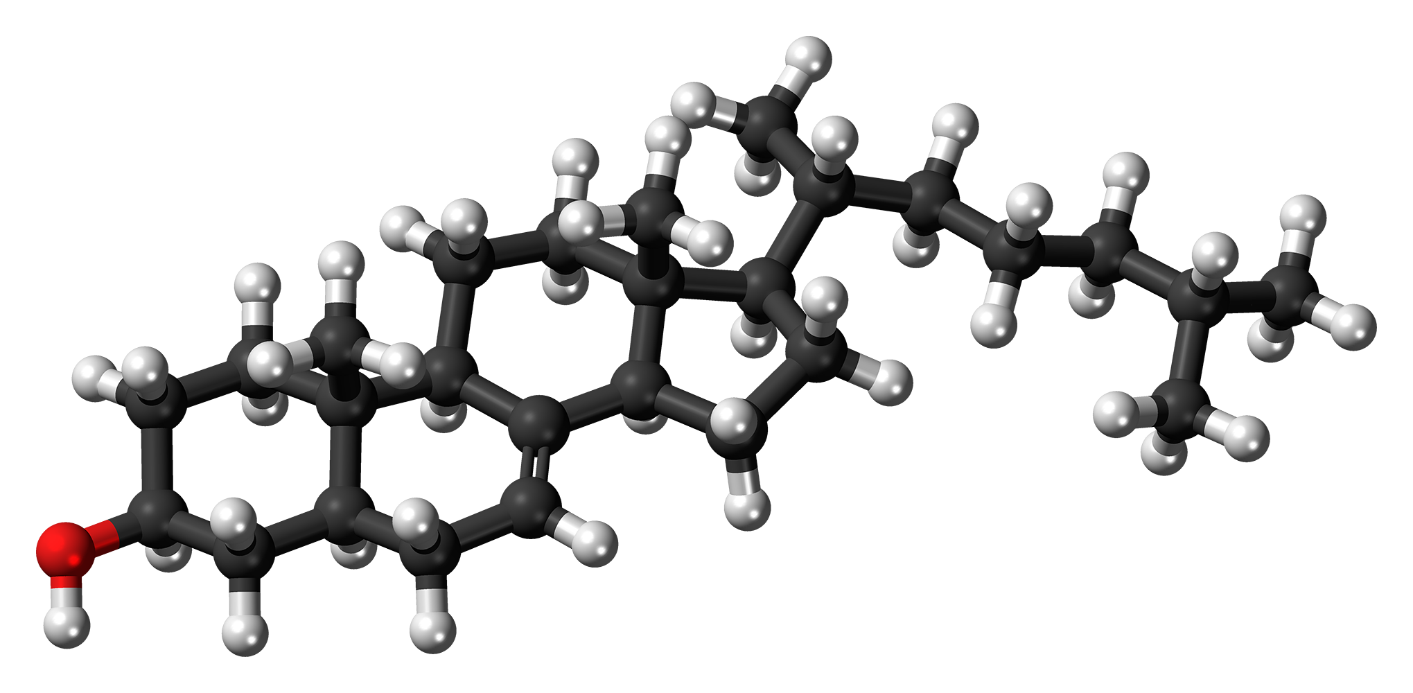 Ball-and-stick model of the lathosterol molecule, a steroid similar to cholesterol. Color code: